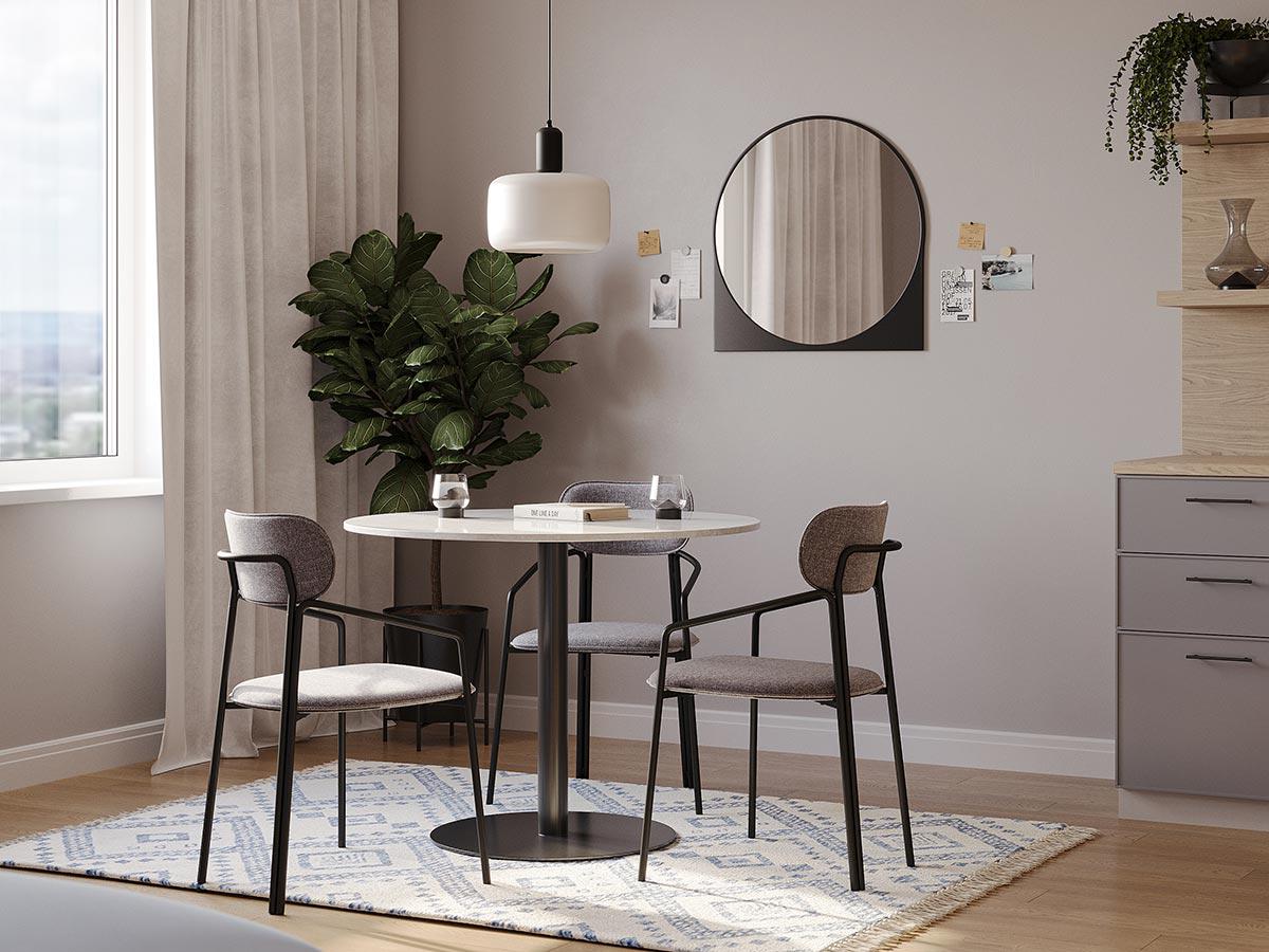 Коллекция Ror - это мебель с индивидуальным характером. Каркас стула Round состоит из трех стремящихся вверх элементов, которые образуют округлый, словно окутывающий корпус. За счет отсутствия прямых углов создается легкий, гармоничный силуэт. Стальное основание с порошковым покрытием делает конструкцию прочной и надежной, а меланжевая ткань обивки обладает высокими показателями износостойкости. Используемый пенополиуретан отличается комфортной плотностью и жесткостью. Все материалы отвечают высоким стандартам практичности, долговечности и экологической безопасности. Стул украсит собой любой современный интерьер: подойдет для оформления обеденной группы, рабочего пространства или зоны отдыха. Материалы: сталь, фанера, 100% пенополиуретан, 100% полиэстер. Размеры: 50х58х83 см. Высота сиденья: 45 см. Ширина сиденья: 44 см. Глубина сиденья: 45 см. Высота спинки: 37 см. Ширина спинки: 38 см. Максимальная нагрузка: 102 кг. Цвет: черный/серый. Загрязнения удалять с поверхностей мыльным раствором воды при помощи мягкой губки или салфетки.