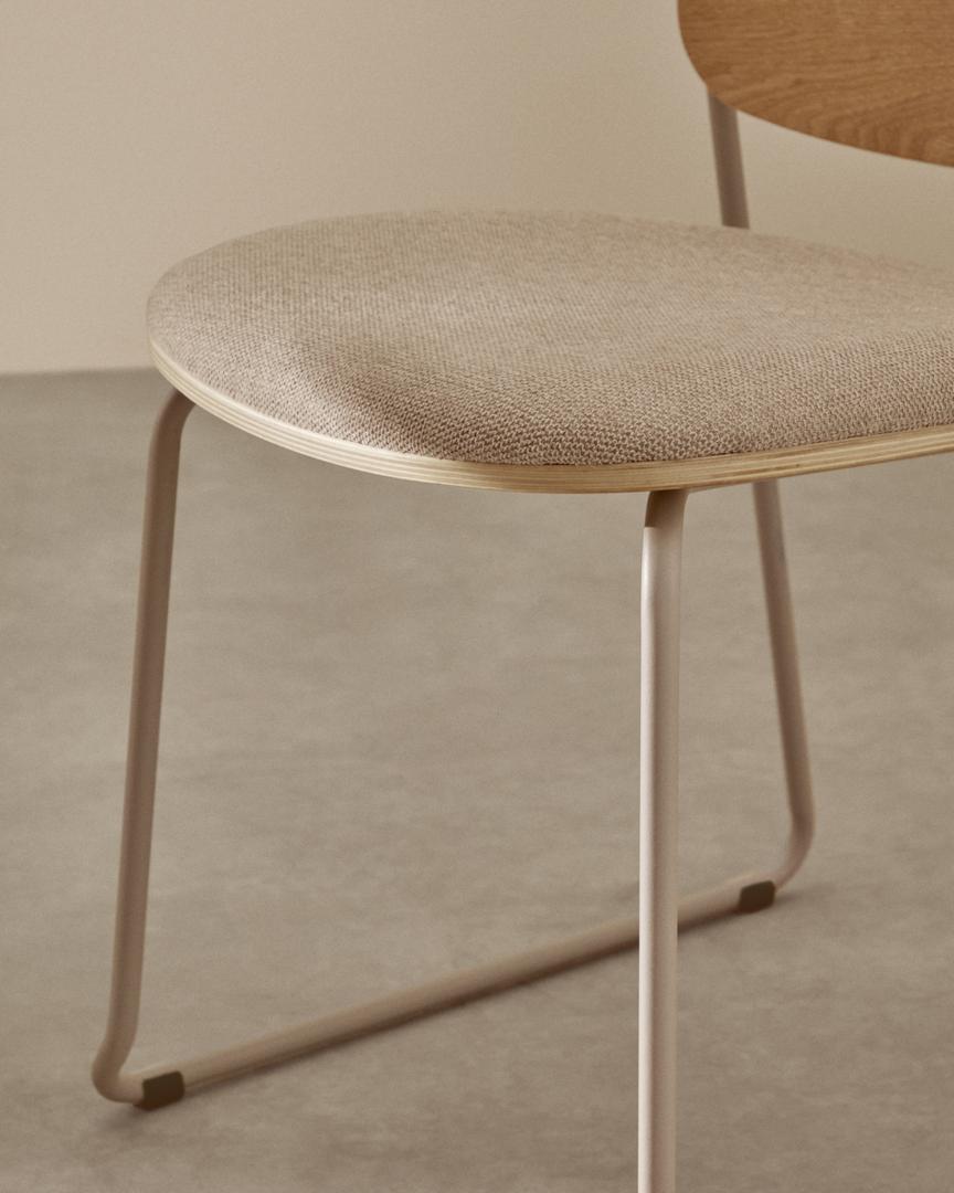 Этот стул переопределяет функциональную элегантность для любого пространства. Спинка, выполненная из шпона тополя, подчеркивает теплоту материала, а сиденье, обитое мягкой шениллой, обеспечивает комфорт. Эта ткань также сертифицирована по стандарту OEKO-TEX® STANDARD 100, что гарантирует экологически ответственное производство. Дизайн дополняют ножки из микротекстурированного металла нежно-бежевого тона, что добавляет современный и изысканный штрих. Используемая древесина имеет сертификат FSC Mix Credit, который гарантирует, что она изготовлена из смеси материалов из сертифицированных FSC лесов и контролируемой FSC древесины. Каждый стул уникален благодаря тщательному выбору шпона тополя, что гарантирует естественные вариации в дизайне, делая каждое изделие эксклюзивным. Защитные накладки на ноги гарантируют, что пол останется нетронутым, добавляя функциональности без ущерба для эстетики. Такие детали, как видимые винты из нержавеющей стали с двухотверстийным дизайном, усиливают его отличительный характер.