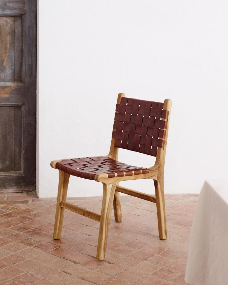 Сиденье кресла Calixta изготовлено из коричневых кожаных ремешков с ручным плетением, идеально подходящих для любого уголка вашего дома. Конструкция изготовлена из цельного тикового дерева, поэтому она также является дизайнерским изделием, которое прослужит вам долго. Благодаря натуральным материалам, каждый стул имеет свои тона и фактуру, что делает каждый предмет эксклюзивным и неповторимым.