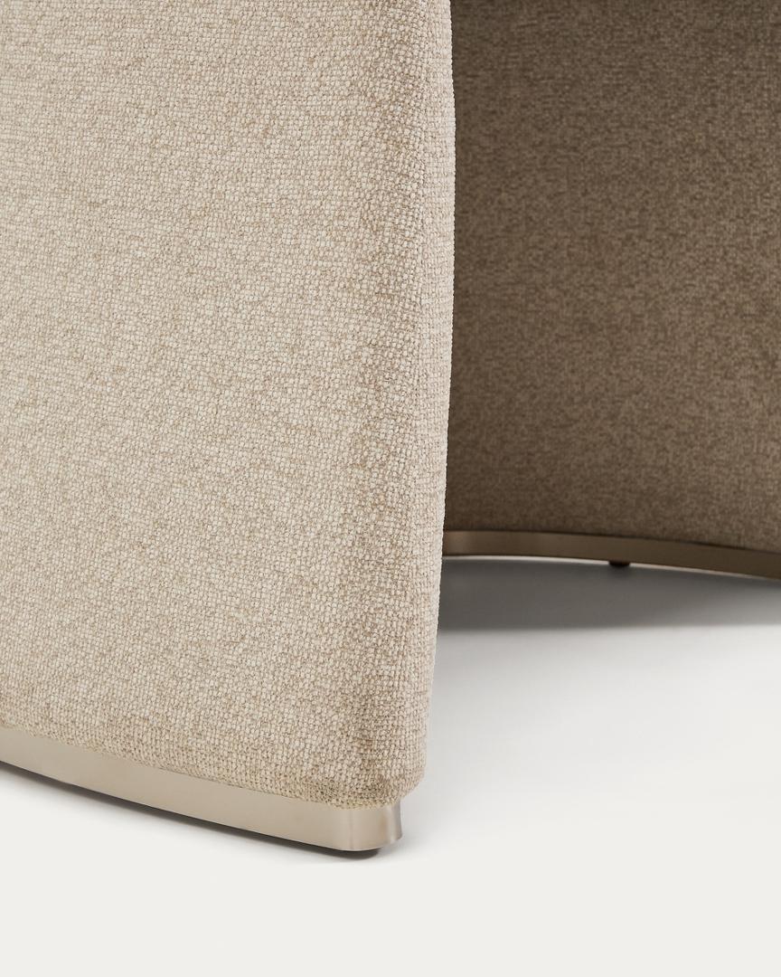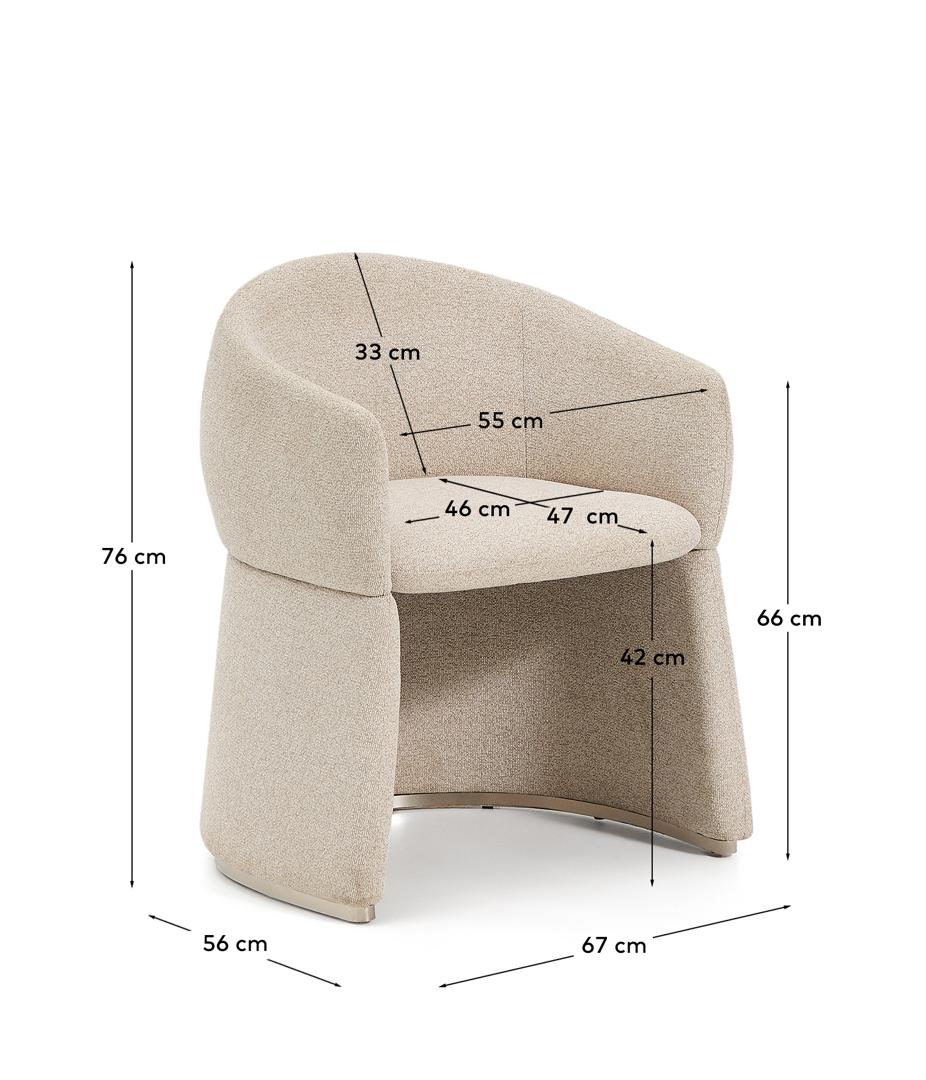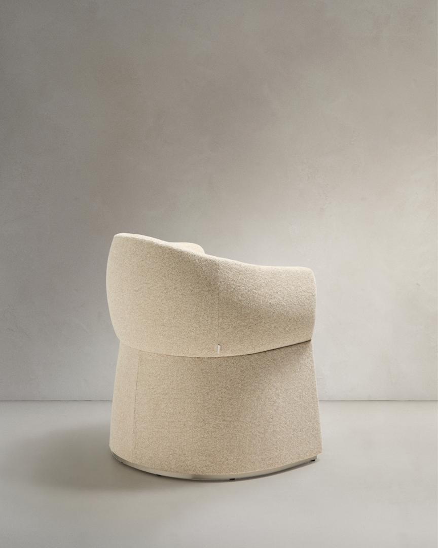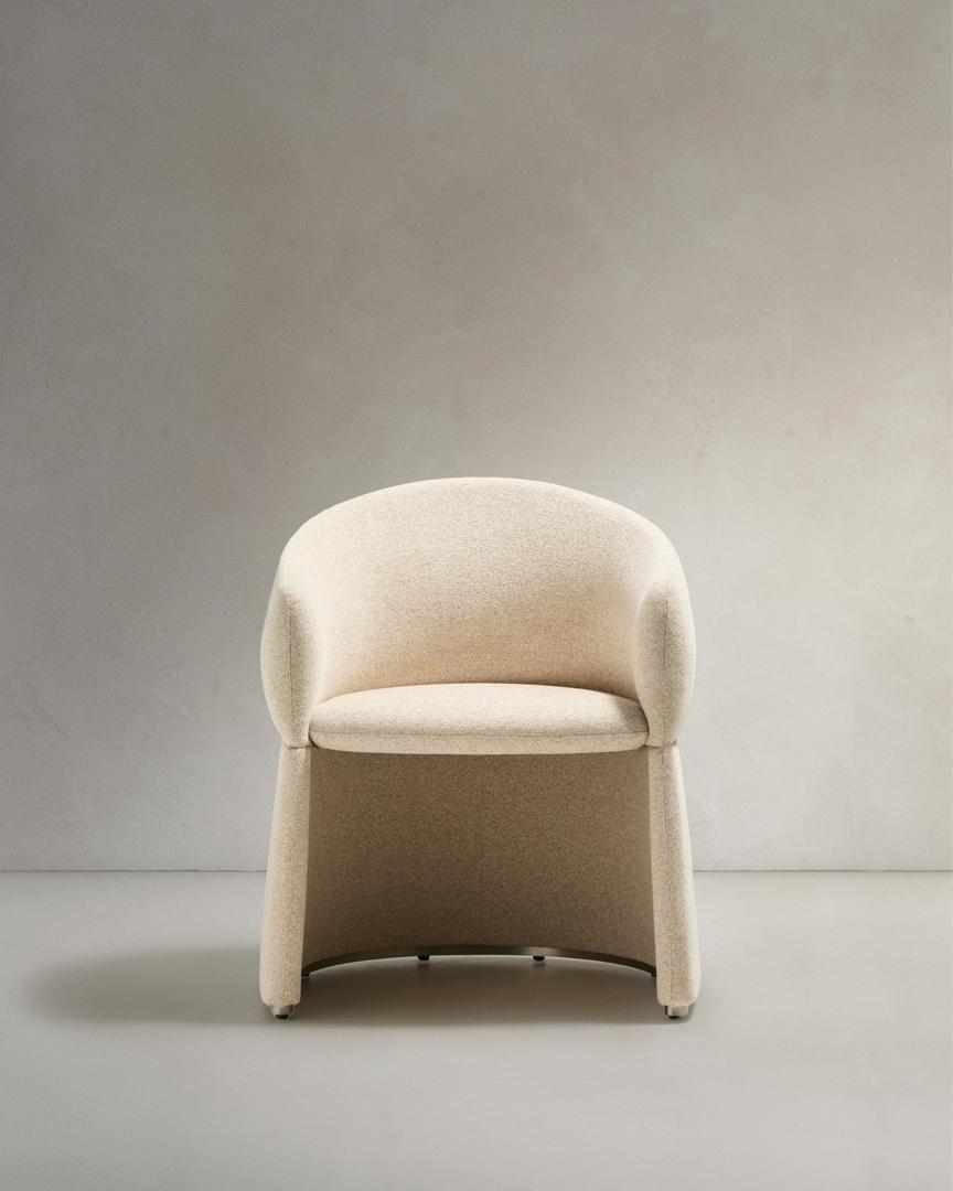 Этот стул выделяется своим скульптурным дизайном, в котором обволакивающие формы гармонично сочетаются с утончённым, изысканным силуэтом. Широкое, уютное сиденье опирается на обитое фанерное основание с металлическим каркасом по периметру для защиты ткани. Обивка выполнена из мелкоструктурированного шенилла: мягкого на ощупь, прочного для ежедневного использования и изготовленного из 100% переработанного полиэстера от поставщика, сертифицированного по Глобальному стандарту переработки. Эта ткань обработана водоотталкивающими составами и имеет сертификат OEKO-TEX® S.