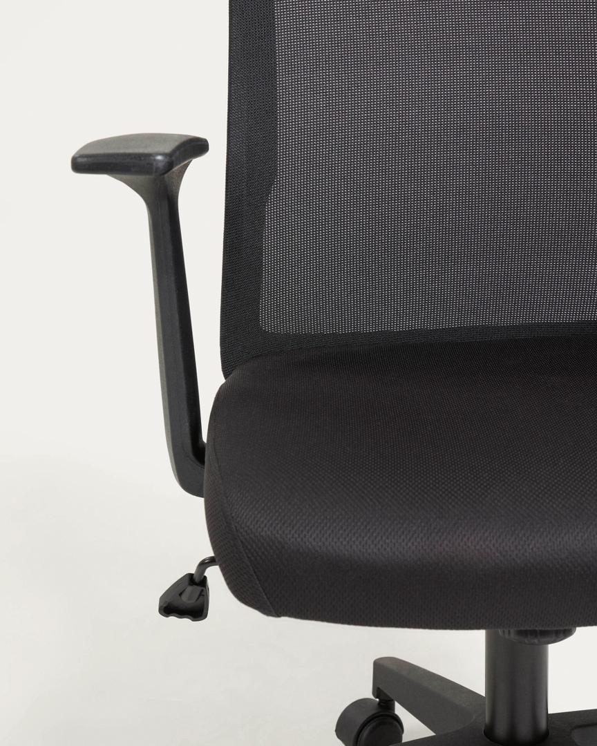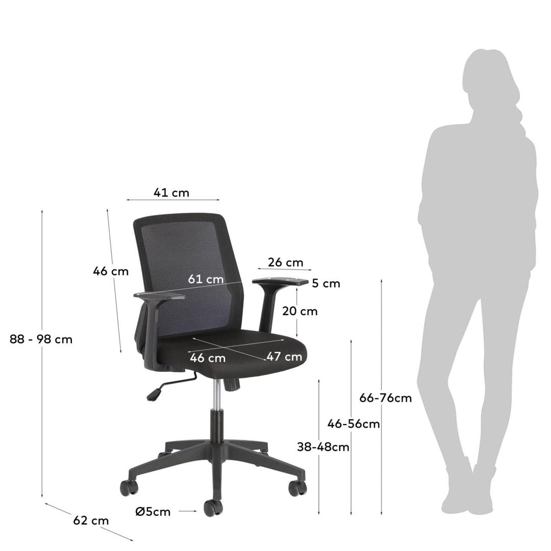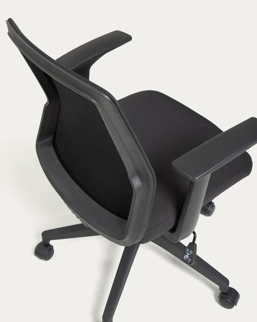 Офисное кресло Nasia от фабрики La Forma (ex Julia Grup) – удобство и современный дизайн для домашнего кабинета. Офисное кресло Nasia – замечательная модель для организации рабочего процесса дома. В нем эргономика продумана до мелочей, а современный дизайн подойдет под любой городской интерьер. С регулировкой высоты, анатомической спинкой и колесами вы наверняка будете чувствовать себя комфортно при любых занятиях. А защита от пятен на обивке обеспечит легкий уход. С креслом Nasia вы будете получать удовольствие от работы! Кресло имеет сборную конструкцию. Оно состоит из ножки и сиденья. Ножка изготовлена из металла, где верхняя часть имеет хромированное покрытие, а разветвление окрашено в черный матовый цвет порошковой краской. Ножка оснащена газлифтом, который меняет высоту кресла в пределах 10 см. Ножки оснащены колесиками, благодаря которым кресло поворачивается на 360 градусов. Они не царапают пол, поэтому подходят даже для паркета. Диаметр – 5 см. Нижняя часть сиденья сделана из прочной фанеры, которая обита пеной плотностью 35 кг/м3 (средняя жесткость). Обивка сделана из плотного текстиля и сетчатой ткани (на спинке) черного цвета. Состав материала – 100% полиэстер. Окантовка спинки и подлокотники сделаны из полипропилена черного цвета. Максимальная весовая нагрузка на кресло – 130 кг. Размеры: ширина сиденья – 47 см, высота – от 88 до 98 см, глубина сиденья – 46 см. Вес изделия – 9,5 кг. Потребуется сборка. Для чистки сиденья использовать салфетку, смоченную в мыльной воде.