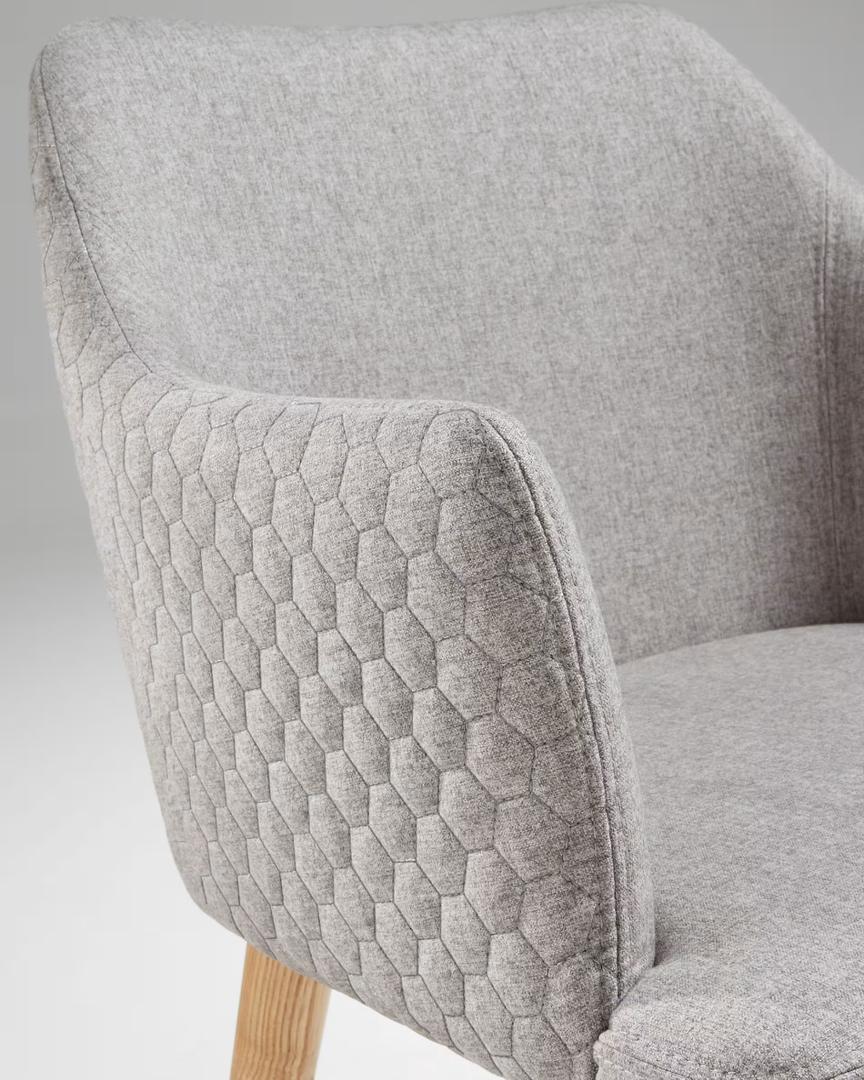 Стул Danai серый от испанских дизайнеров фабрики La Forma (ex Julia Grup) — стильный предмет мебели для создания безусловного модерна. Стул точно заслуживает внимания. В этой модели гармонично сочетаются оригинальный дизайн и традиционные основы производства испанской мебели — использование натуральных материалов и демонстрация высокого качества. Выставленные напоказ деревянные ножки, стеганая спинка — все это не просто удивляет, это притягивает! Данный предмет мебели создан в современном европейском стиле. Конструкция схожа с креслом — спинка переходит в бортики, а сиденье широкое и глубокое. В качестве материала обивки выбран современный текстиль. Это прочный и тактильно приятный материал, обладающей высокой прочностью, но требующий деликатной чистки с использованием специального шампуня для мебели. По всему изделию есть слой наполнителя. Мягкость стула отлично демонстрирует декоративная строчка в виде шестиугольников, покрывающая всю заднюю поверхность спинки. Ножки сделаны из ценной и прочной породы дерева, бука. Они имеют натуральный цвет, лишь покрыты слоем прозрачного лака. Вверху ножки соединены с крестовой перекладиной, которая крепится к тыльной стороне сиденья. Стул прочный и устойчивый (выдерживает нагрузку более 100 кг.). Размеры — 54 см×80 см×57 см (ширина, высота, глубина). Вес — 8,2 кг. Коллекция Danai объединяет в себе четыре аналогичные модели с разным цветом обивки — желтой, серой, графитовой и голубой.