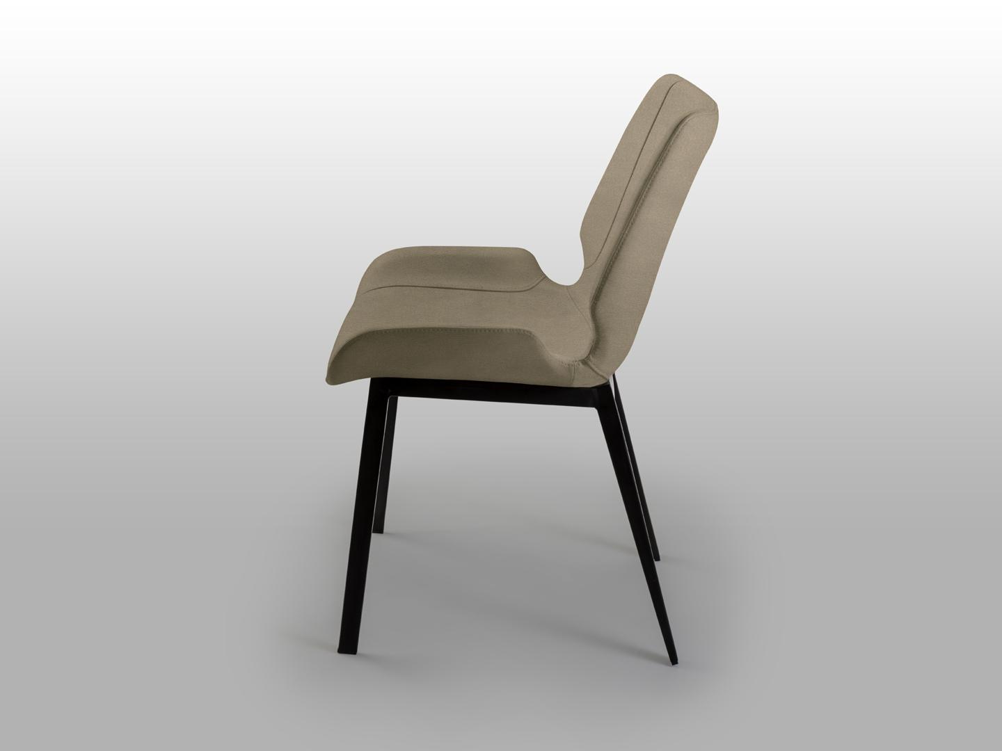 Стул металлический, матовый черный. Сиденье и спинка из пенопласта и фанеры. Обивка из 100% полиэстера и текстиля бежевого цвета с декоративной строчкой.