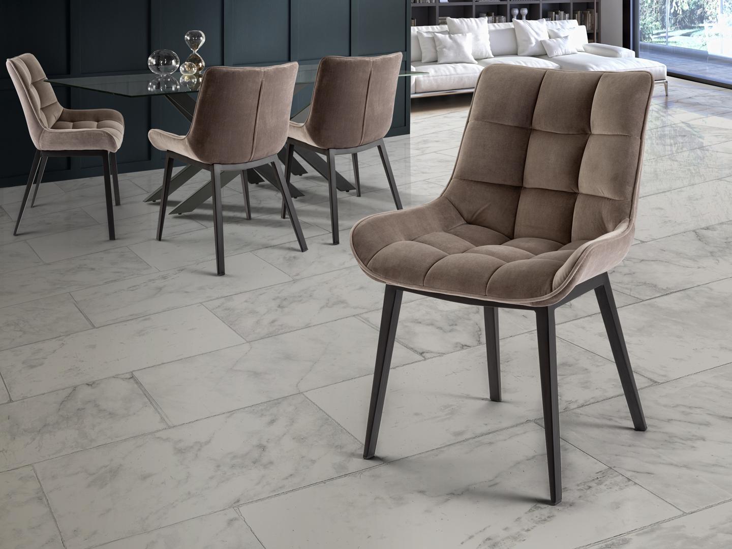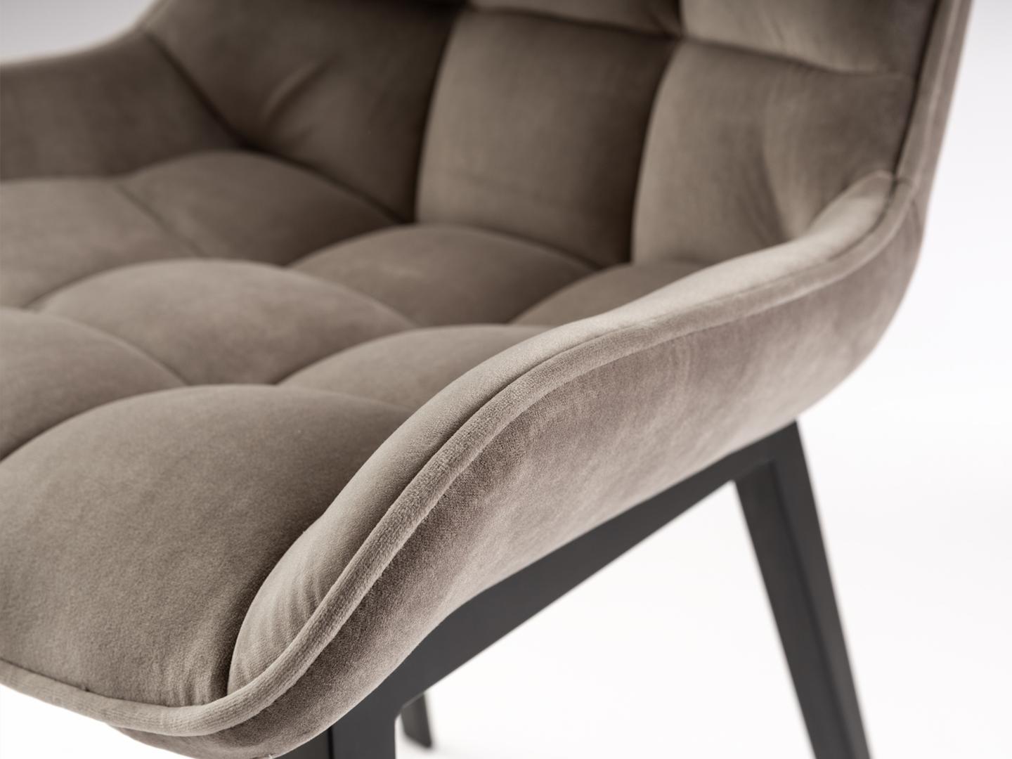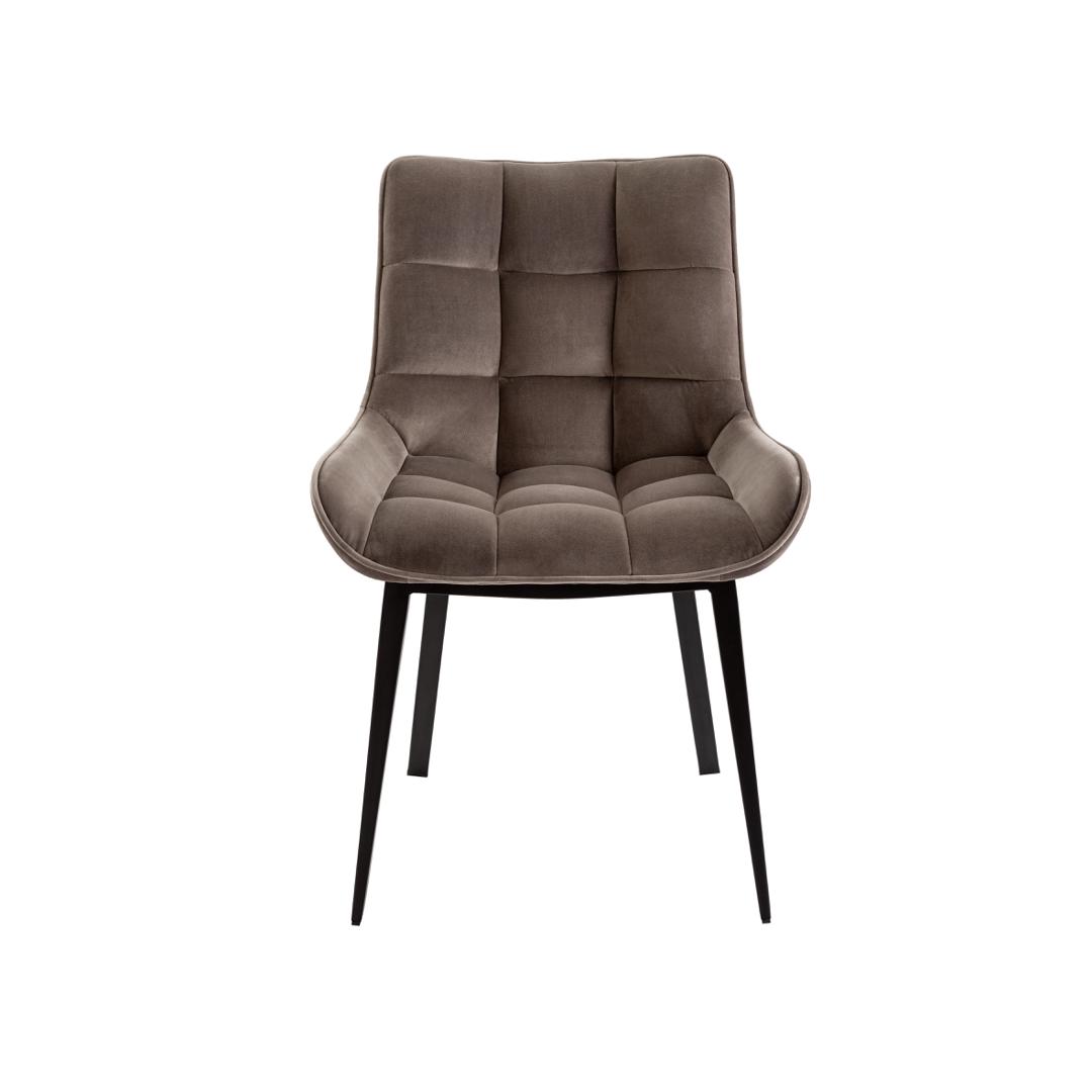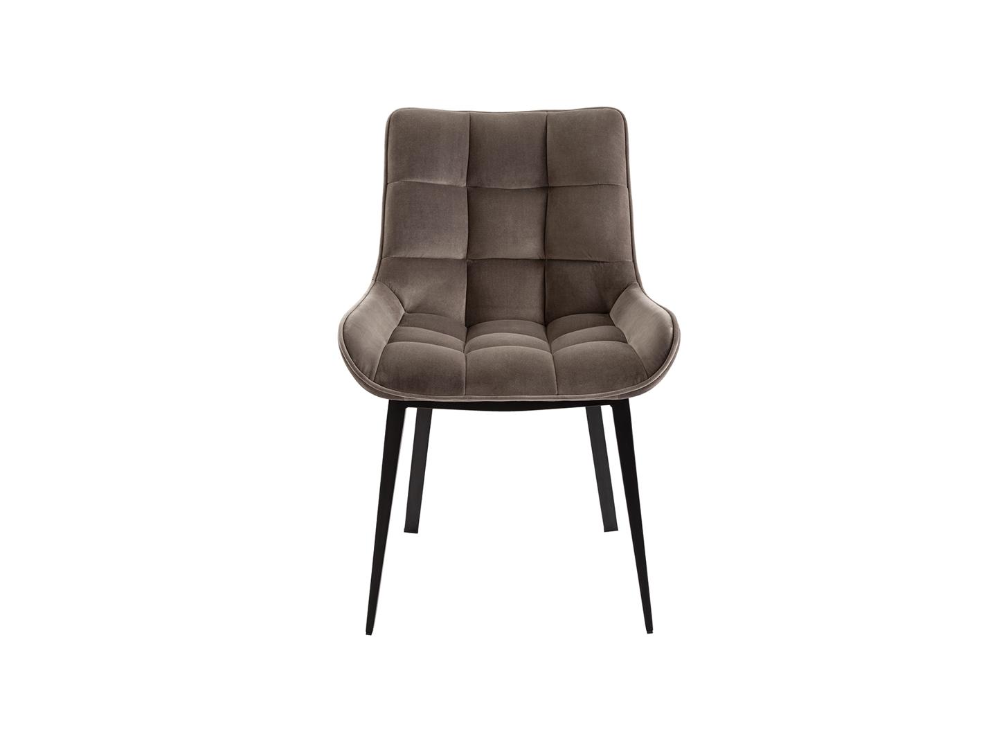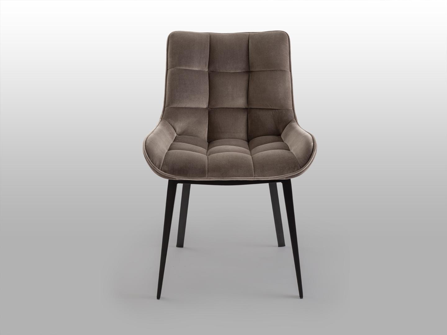 Стул из металла с чёрным матовым покрытием. Сиденье и спинка из фанеры и наполнителя. Обивка из бархата цвета "камень", полиэстр 100%.