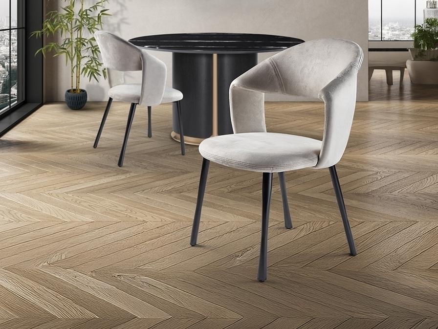 Стул из металла и изогнутой фанеры. Металлические ножки с черной отделкой и обивкой под замшу в цвете камня.
