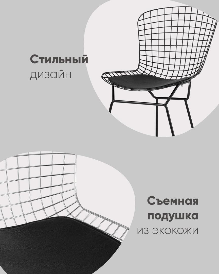 Стул обеденный Bertoia металлический черный с черной подушкой из экокожи