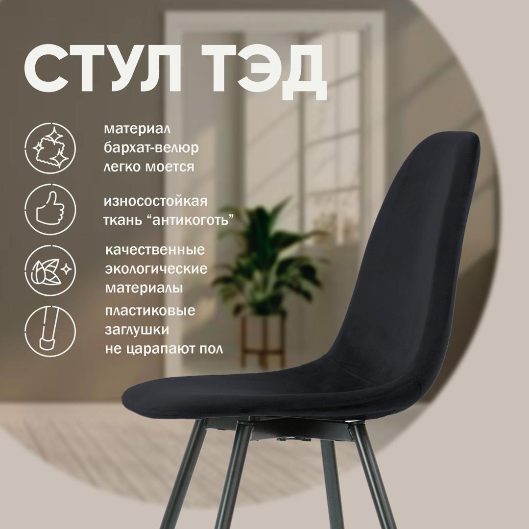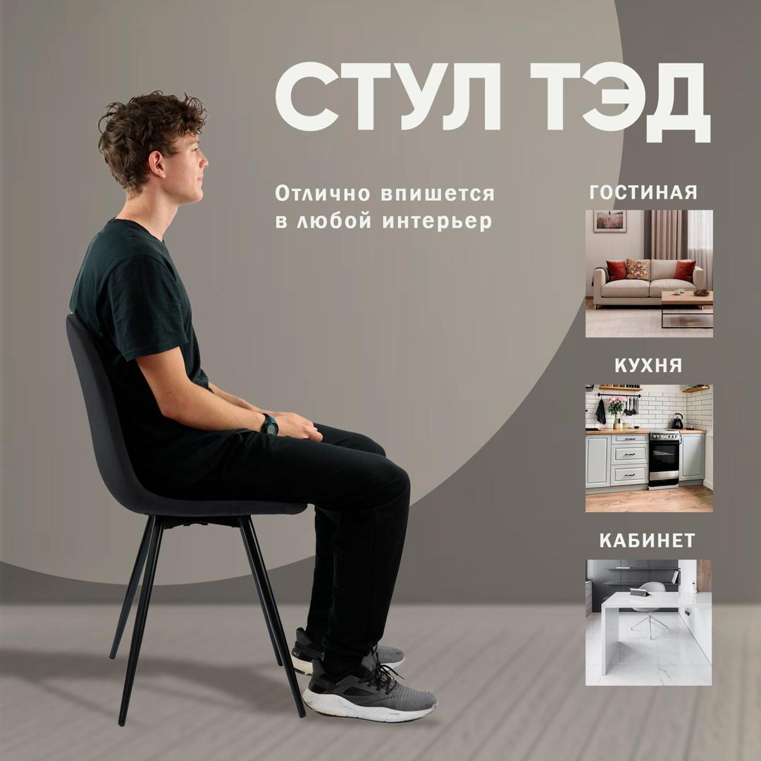 strong*Оттенок может выглядеть по-разному в зависимости от направления ворса./strong «Тед» - универсальный стул с лаконичным дизайном и удобной посадкой. Отсутствие декоративных элементов и простые линии позволяют сочетать модель с интерьерами разных стилей и не переплачивать за декор. h3Каркас/h3 Прочный металлический каркас обеспечит продолжительный срок службы. h3Наполнитель/h3 В качестве наполнителя сиденья и спинки используется высокопрочный пенополиуретан. При ежедневной эксплуатации на протяжении длительного времени он сохранит первоначальную форму. Данное наполнение - это гарантия продолжительного срока службы изделия, что особенно важно для коммерческого использования. h3Опоры/h3 Металлические ножки черного (могут быть белого) цвета. На ножках предусмотрены специальные пластиковые накладки, которые защищают пол от царапин. h3Гарантия/h3 Тщательная проверка качества изделий осуществляется на всех этапах производства: от подбора материалов и комплектующих до проверки готового изделия перед отправкой. На все изделия Top concept мы предоставляем гарантию 18 месяцев.