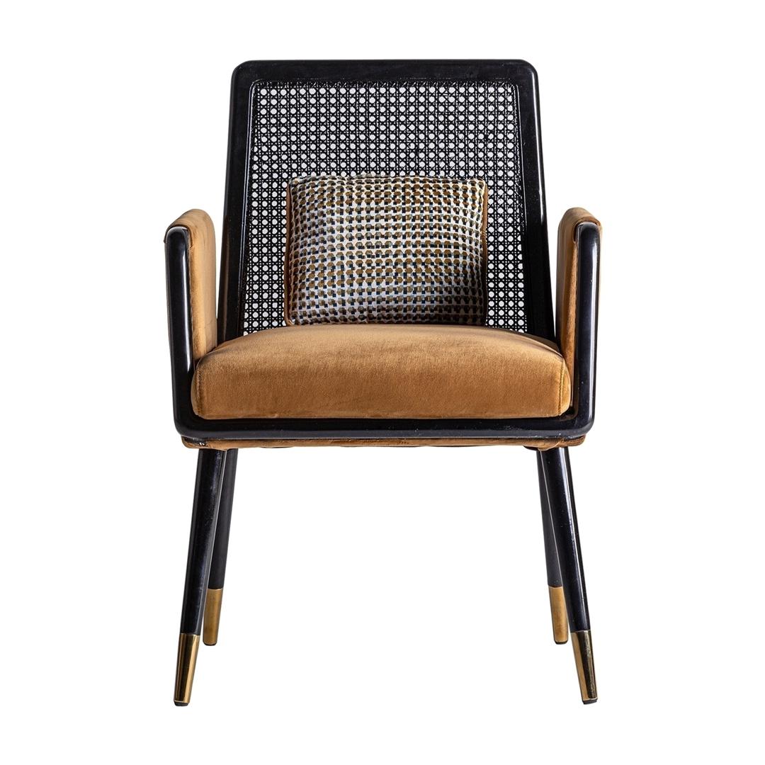 Стул BRILLION от фабрики Vical - древесина ореха в сочетании с ротангом и бархатом. Стул BRILLION — элемент мебели для гостиной в стиле арт-деко. Здесь потрясающий дизайн создан необычными формами и сочетанием разных фактур. Бархатная обивка в горчичном цвете демонстрирует тепло и мягкость. А натуральная древесина двух видов создает уникальный вид. Стул BRILLION поднимет интерьер вашей гостиной на новый уровень! Стул имеет деревянный каркас, ножки которого сделаны из массива орехового дерева. Они покрыты лаком и золотой эмалью, что придает им элегантный вид и защищает от негативного воздействия внешней среды. На ножках установлены наконечники, которые улучшают устойчивость и защищают напольное покрытие от повреждений. Спинка сделана из натурального ротанга и также покрыты защитным слоем лака. Обивка имеет бархатную фактуру, плотная, с высокой степенью стойкости к истиранию. Максимальная нагрузка на стул не должна превышать 130 кг. Размеры: ширина – 60 см, высота – 84 см, глубина – 59 см. Вес: 8,7 кг. Стул предназначен для эксплуатации только в помещении. Для чистки использовать деликатные моющие средства и мягкую салфетку. Потребуется минимальная сборка. Инструкция и крепеж включены в комплектацию.