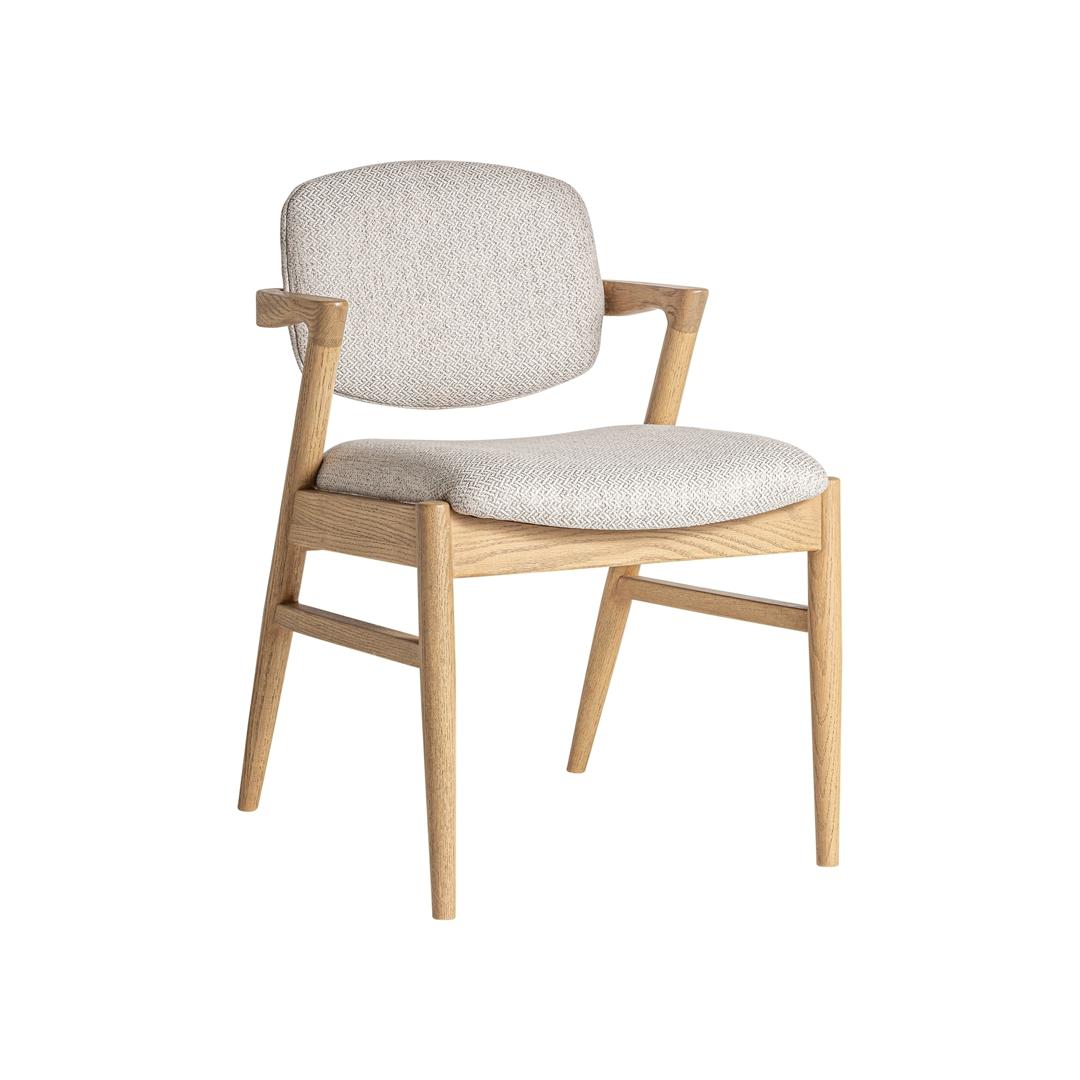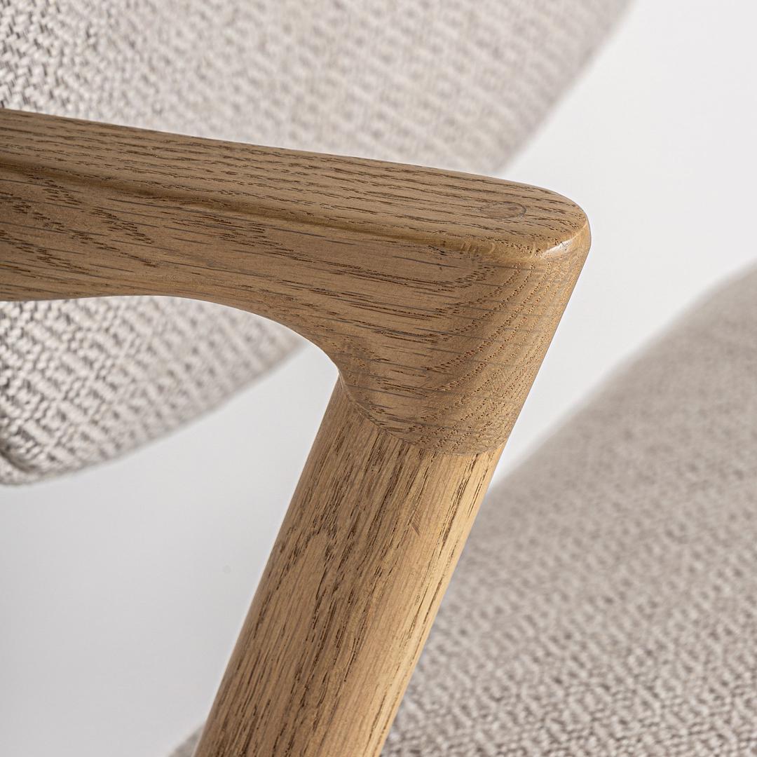 Кресло Essingen в стиле ар-деко, выполнено из коричневого льна в сочетании с бежевым хлопком и древесиной ясеня.