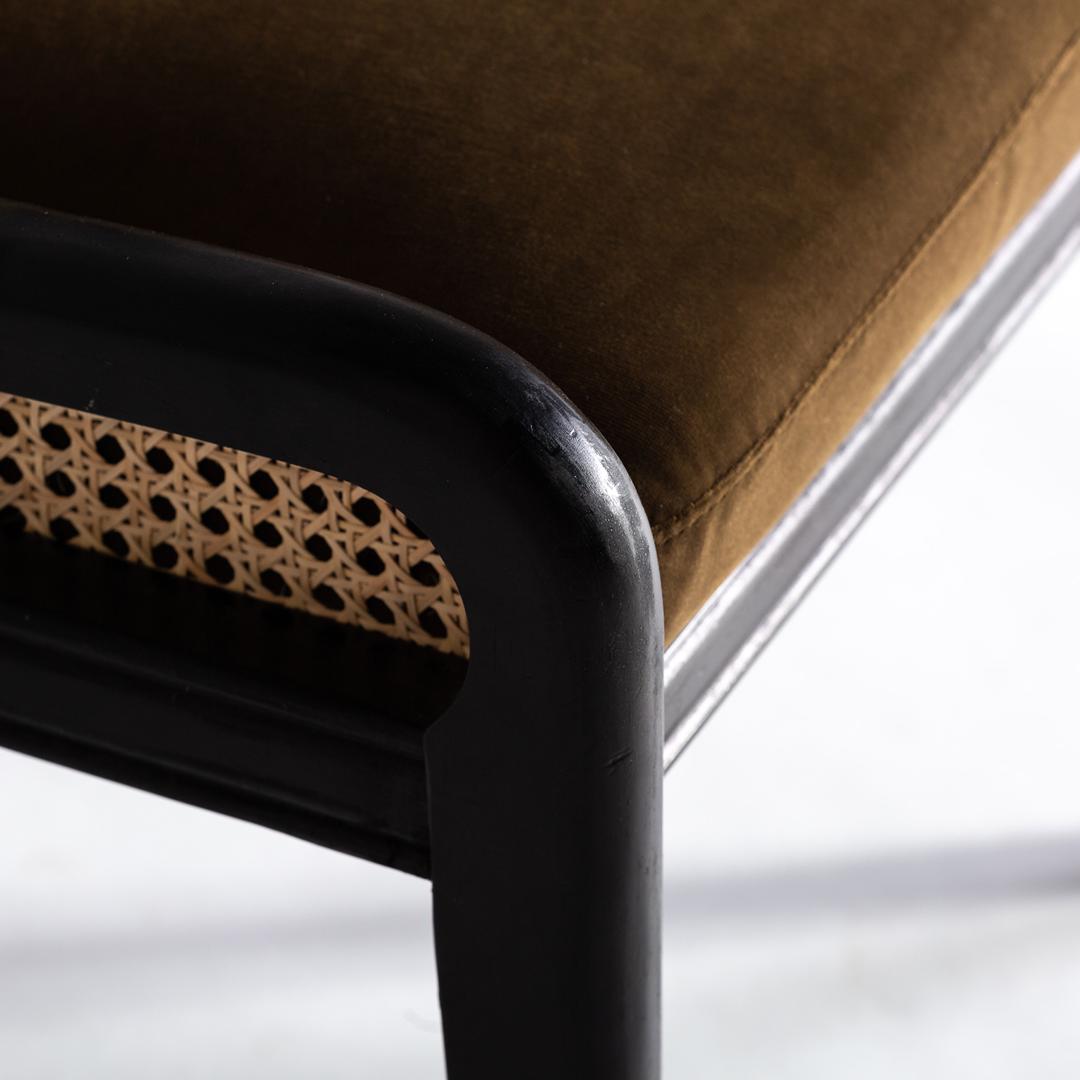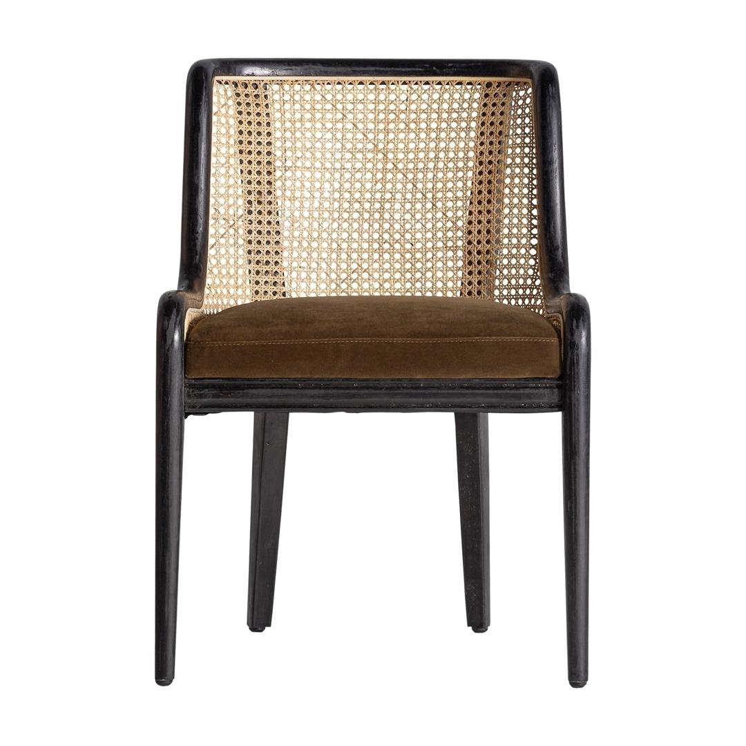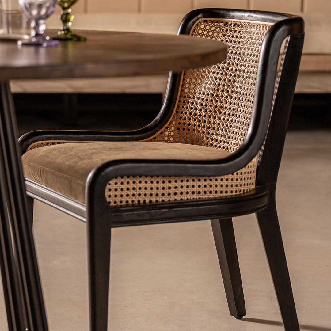 Стул Velburg, черный цвет, колониальный стиль. Изготовлен из ротанга в сочетании с каучуковым деревом и бархатом. Ширина: 54 см, Глубина: 58 см, Высота: 76 см.