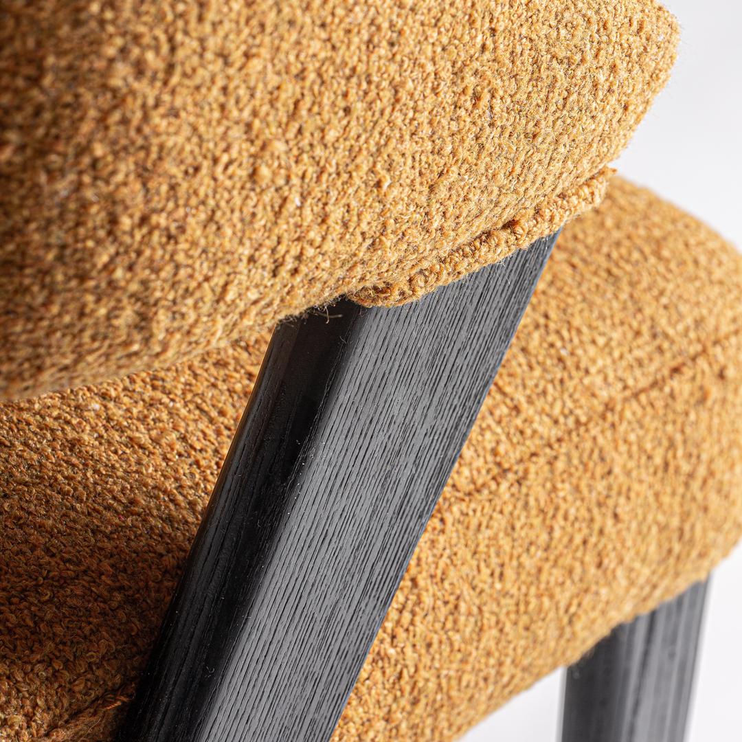Стул, изготовленный из полиэстера горчичного цвета в сочетании с черным дубом и каучуковым деревом.