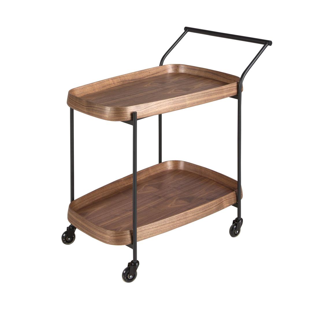 Современный мини-бар на колесиках с двумя подносами, изготовленными из натурального орехового шпона, и конструкцией из нержавеющей стали с черным эпоксидным покрытием, оснащен колесиками для удобного и функционального перемещения.