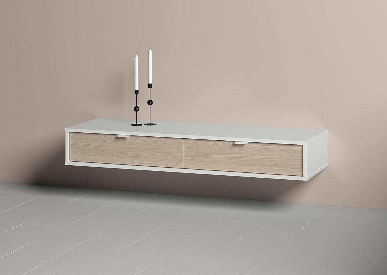 Тумба Fjord 2 ящика подвесная Высота: 18 см Ширина: 122 см Глубина: 41 см Основание: массива бука Корпус: МДФ под эмалью Фасады: шпон дуба