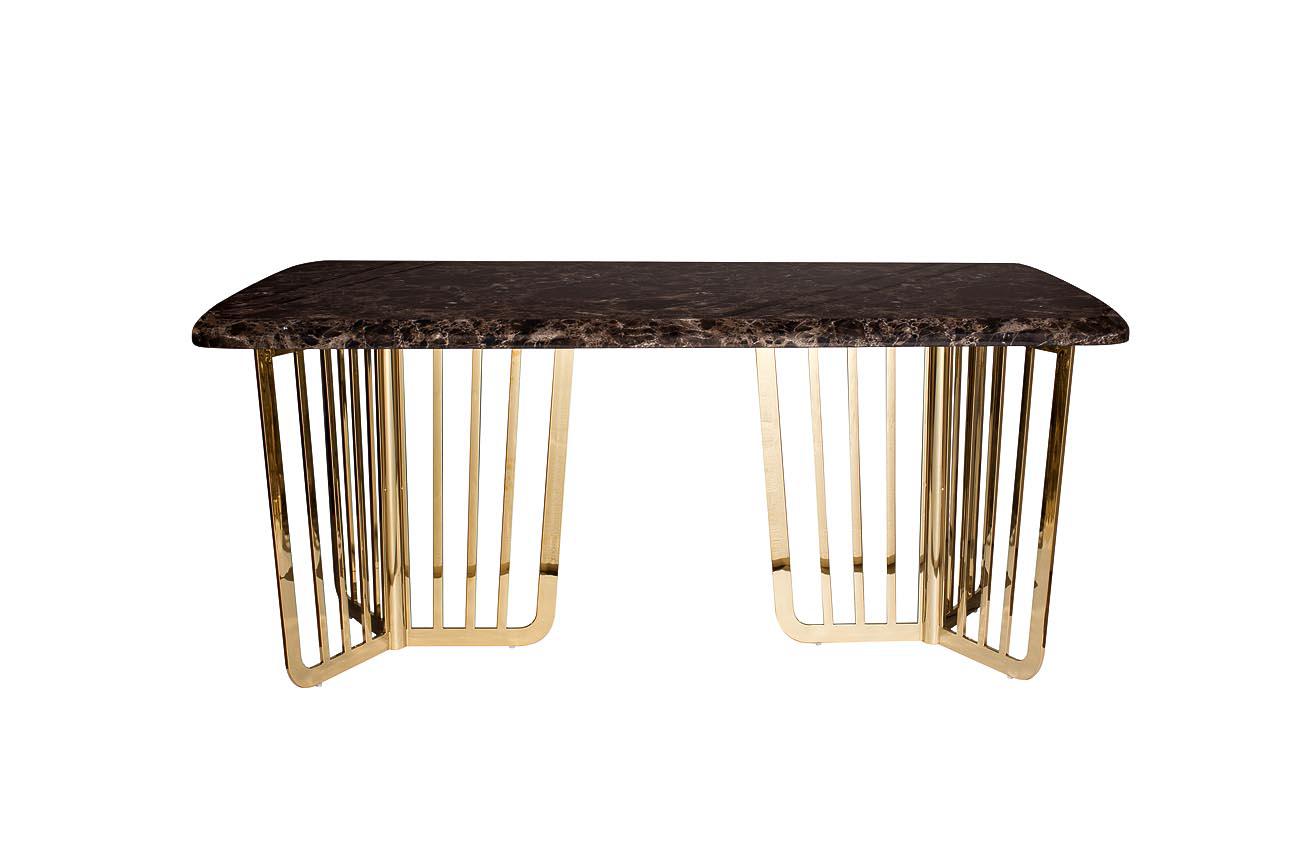 description-full - Коричневый обеденный стол с основанием, выполненным из нержавеющей стали в цвете золото, добавит обстановке вашего дома особого шарма. Не раскладной обеденный стол – отличное решение для просторных кухонь и специальных обеденных зон в гостиной. Если вы предпочитаете роскошные современные стили, необыкновенную изысканную мебель и оригинальные дизайнерские решения – стоит купить представленный стол под мрамор. Такая мебель станет неотъемлемой частью ваших праздников и будничных трапез. Дизайнеры мастерски совместили в этом предмете мебели шикарный внешний вид и надежность конструкции. Толщина столешницы - 30мм. Стол сочетается с журнальными столиками арт. 33FS-CT20C05-PG, арт. 33FS-CT20C05-PG и консолью арт. 33FS-CST20C05-PG из этой же серии.