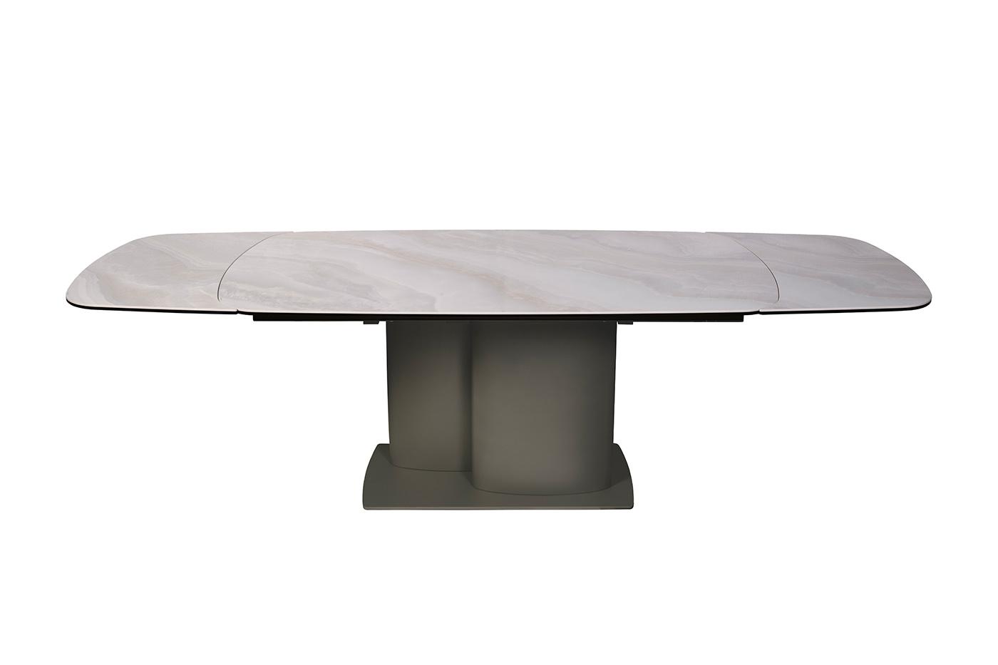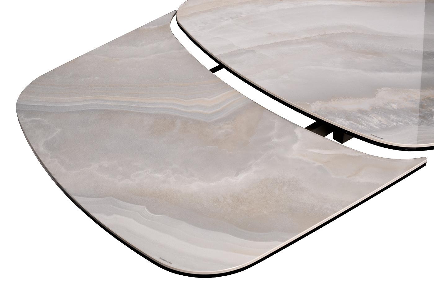 description-full - Раскладной обеденный стол из керамики и металла – идеальный выбор для современных интерьеров. Сочетание благородной керамической столешницы, имитирующей натуральный камень, с элегантной металлической основой создает изысканный и современный образ. Благодаря инновационному механизму, стол легко раскладывается, позволяя с комфортом разместить за ним как небольшую компанию, так и большое количество гостей. Керамическая столешница не только красива, но и практична – устойчива к высоким температурам и легко моется. Просьба обратить внимание, что при перемещении стол следует держать только за металлическое основание, а не столешницу! Иначе столешница может потрескаться.