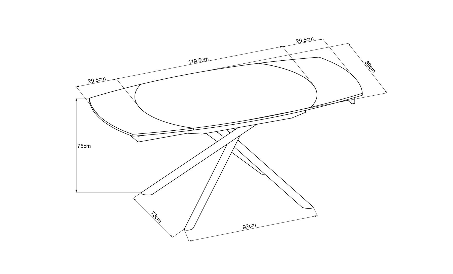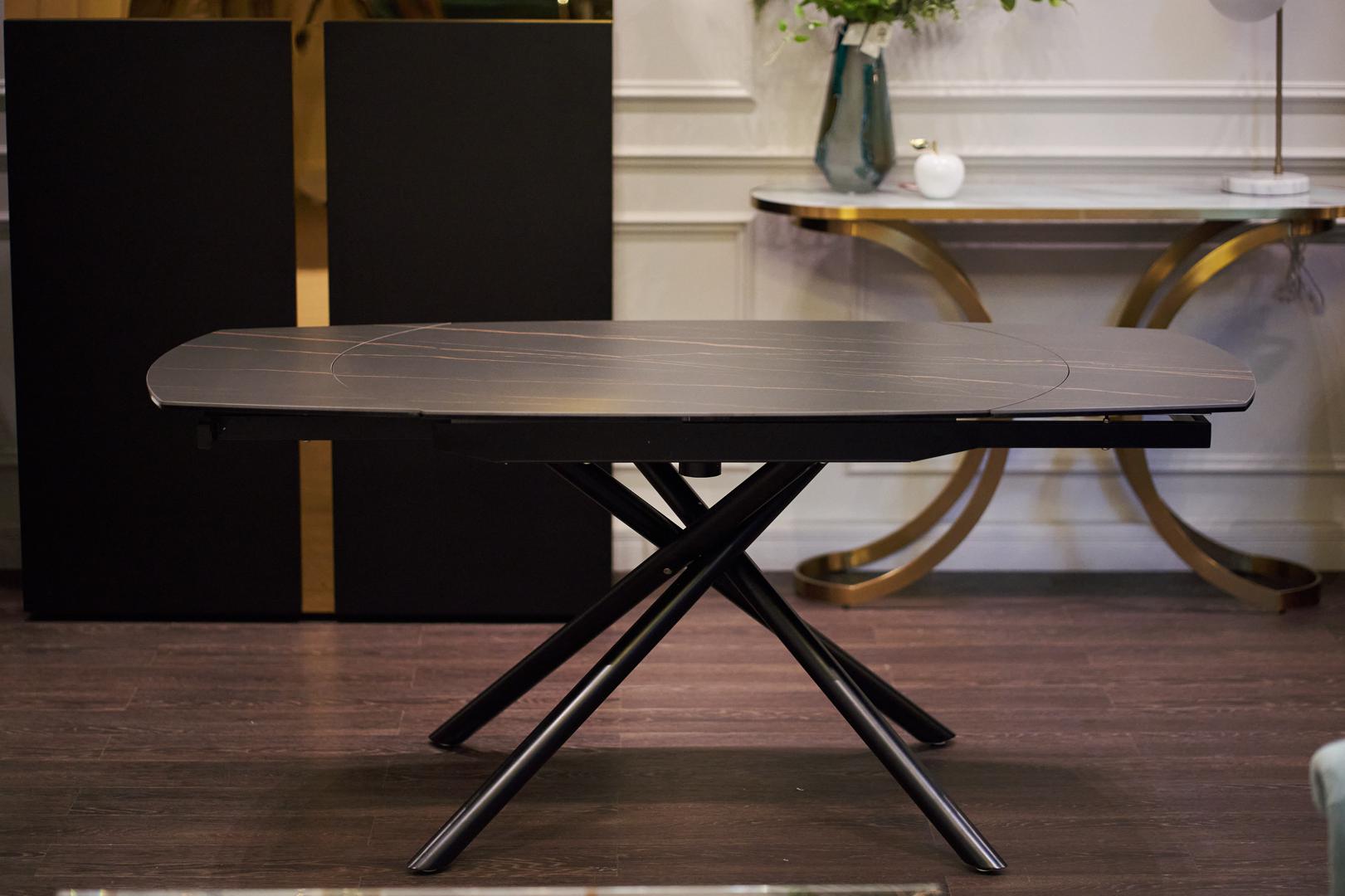 description-full - Удобный и элегантный обеденный стол-трансформер раскладывается одним движением руки. Просто поверните столешницу и стол увеличится в размере. Необыкновенный обеденный раскладной стол с двухслойной столешницей с коричневыми прожилками и черным основанием и ножками. Столешница выполнена из 5,5мм керамики на 6мм закалённом стекле. Такое покрытие в достаточной степени износостойко, декоративно и удобно в быту. В сложенном виде размер столешницы 120*89cм, высота - 77см. В разобранном - 178*89cм, высота 75см. Каркас и ножки изготовлены из покрашенного металла. Данная модель – для тех, кто стремится быть в тренде, кому нравится экспериментировать с новыми дизайнами, для кого простота и комфорт – главное. Наличие такого стола в интерьере — огромный плюс к удобству и способности обстановки изменится исходя из потребности владельца.