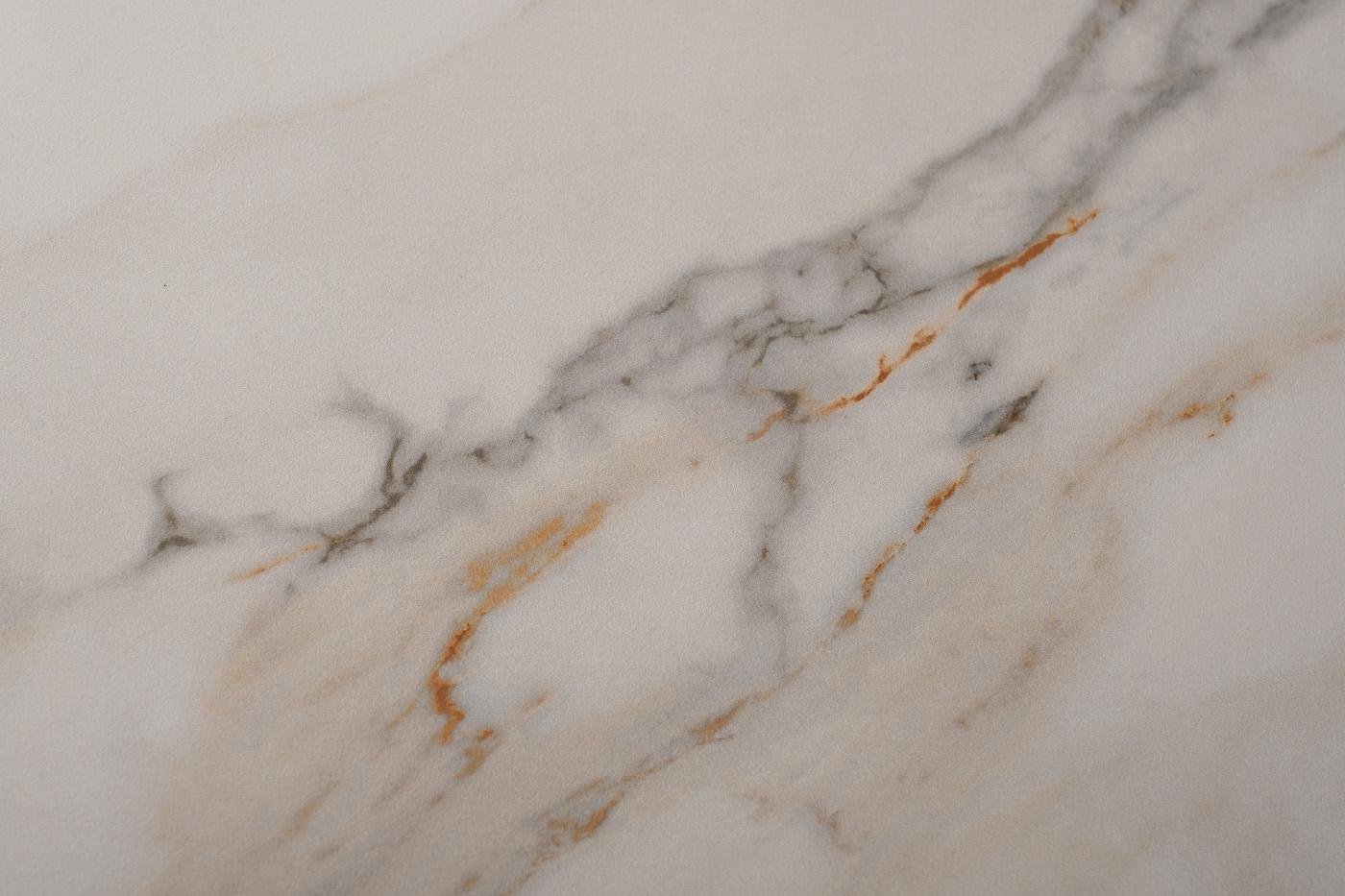 Столешница изготовлена из глянцевого керамогранита с мраморным узором, и обладает высокими характеристиками износостойкости, что является несомненным преимуществом для обеденного стола. Особенностью этой модели является сочетание трех фактур - белой столе...
