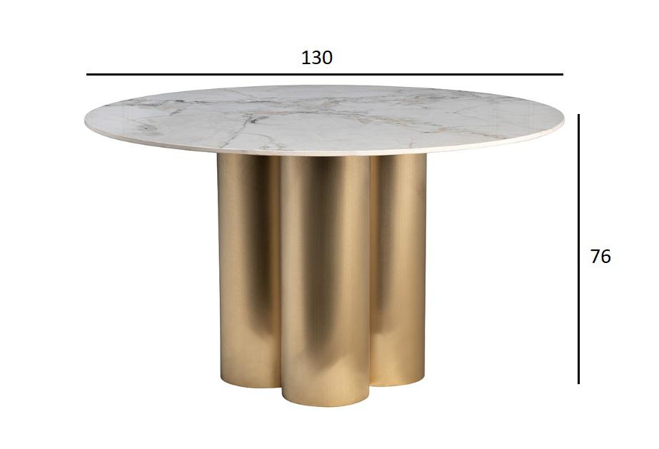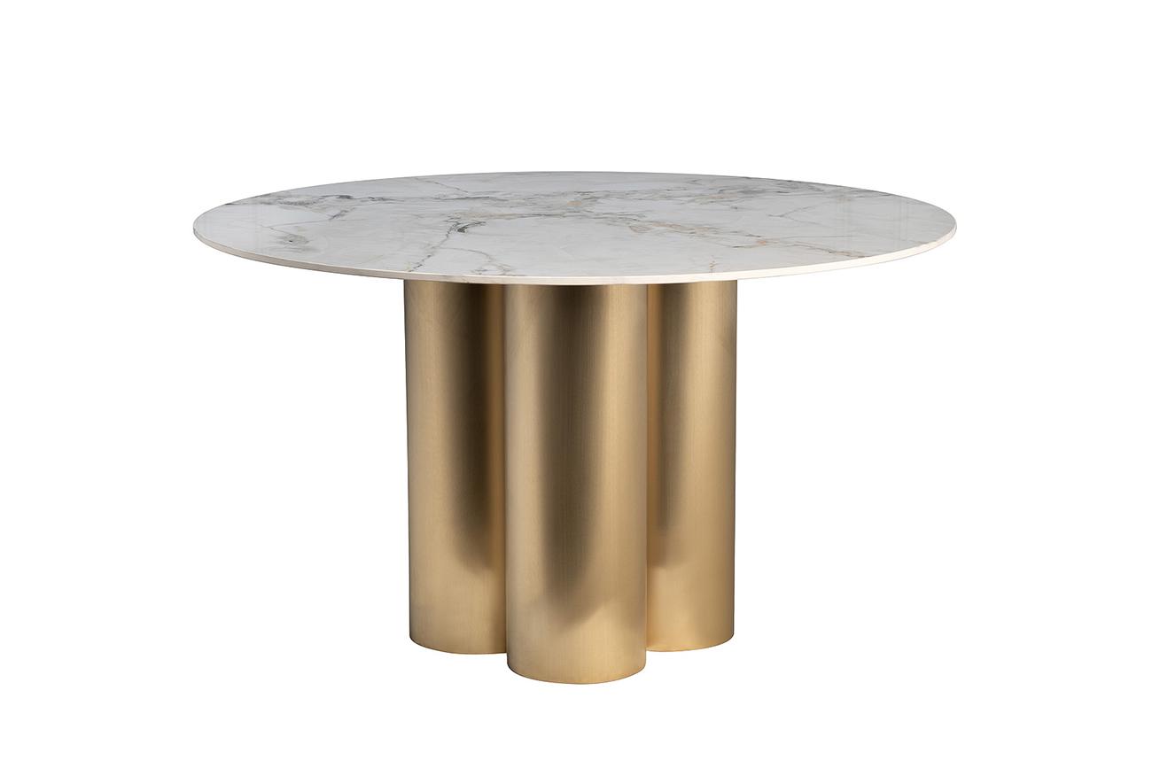 description-full - Обеденный стол из износостойкого керамогранита с глянцевой поверхностью в этой модели сочетается с оригинальным основанием из нержавеющей стали брашированного золотого цвета в форме четырех цилиндров. Этот обеденный стол словно собран из нот архитектуры и света. Керамогранитная столешница с тонким мраморным узором отражает графику природных текстур, а округлое основание из металла в благородном золотистом тоне напоминает об органических формах ар-деко. Визуально лёгкий, но монументальный по духу, он задаёт интерьеру ритм и статус. Стол идеально подойдёт для интерьеров в стиле современная классика, эклектика или арт-хаус. Толщина столешницы - 12мм.