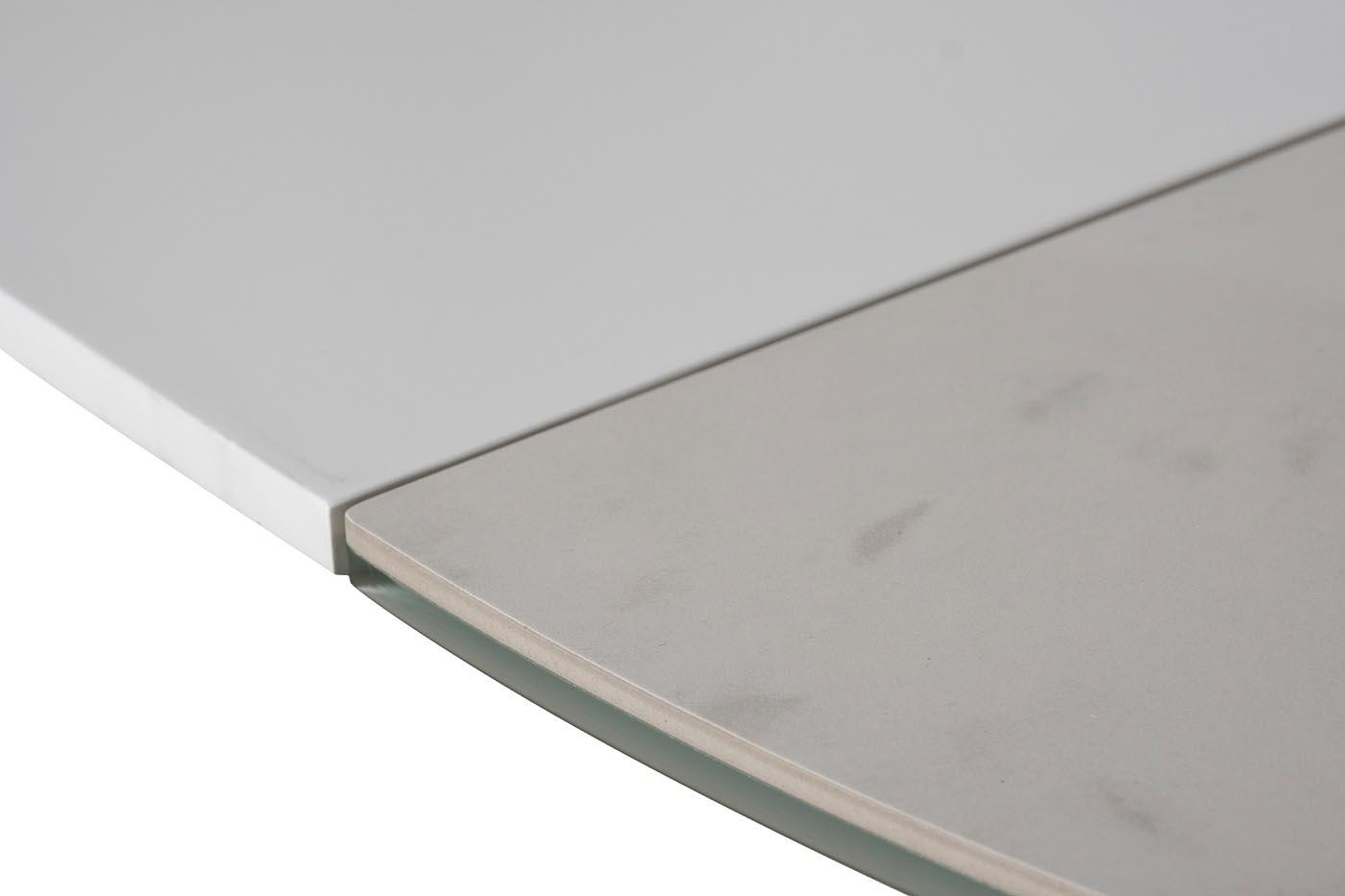 Столешница двухслойная: 5,5мм керамика на 6мм закалённом стекле, центральные расширители - из МДФ белого матового цвета. В сложенном виде диаметр столешницы 1195мм, в разобранном - овал 1695*1195мм. Каркас и ножки изготовлены из покрашенного металла.