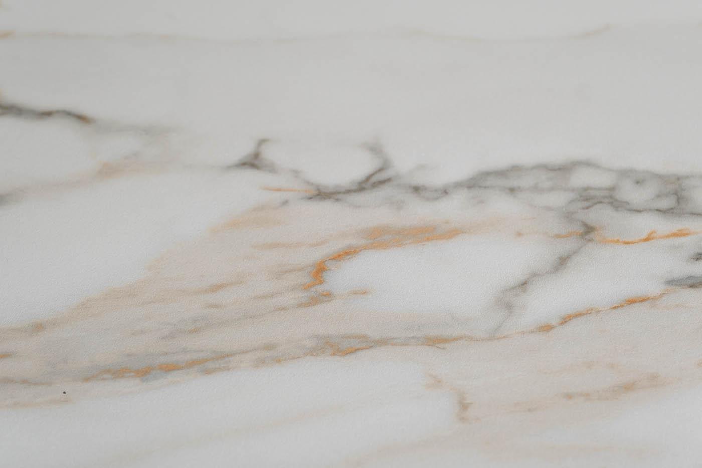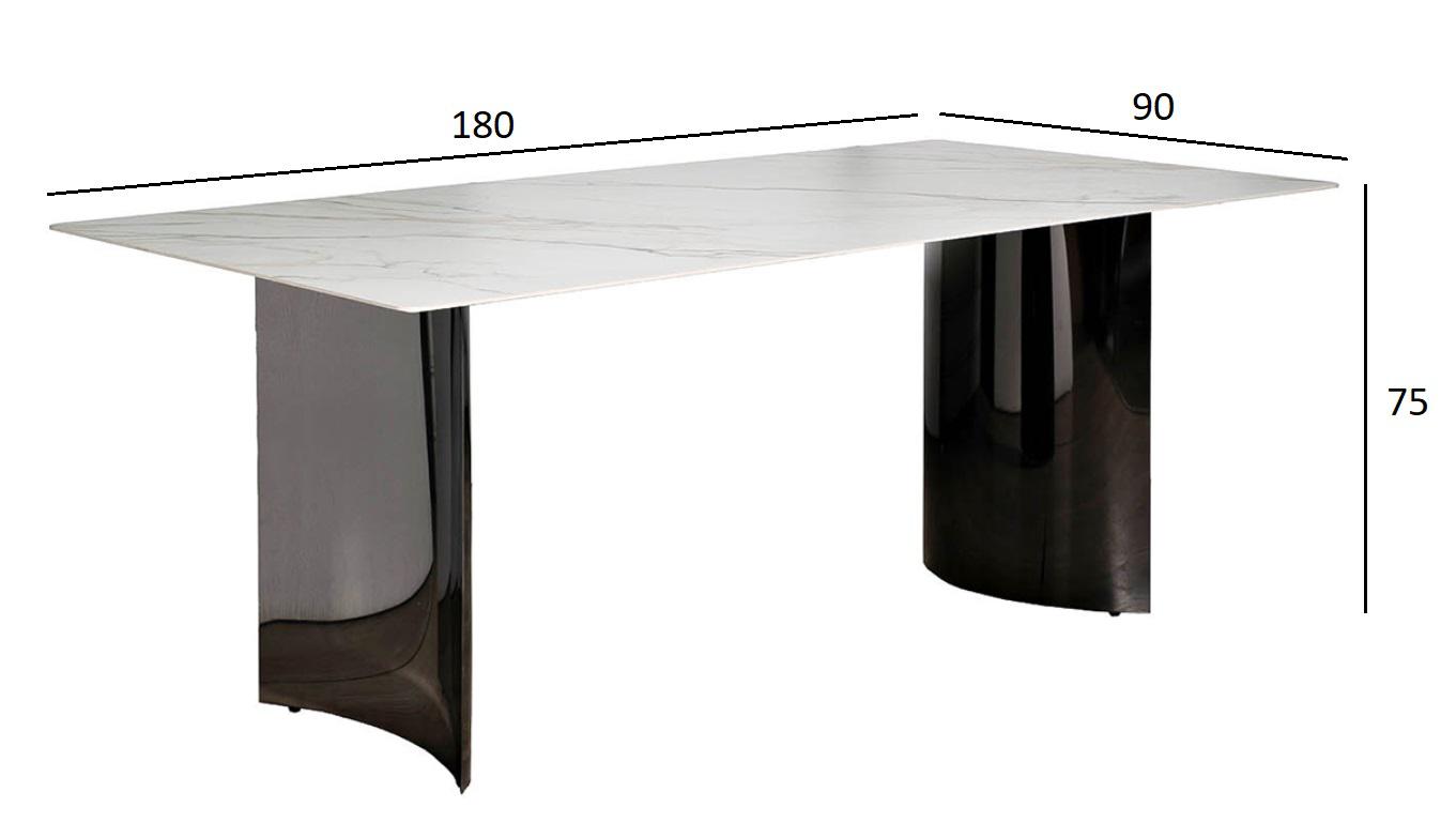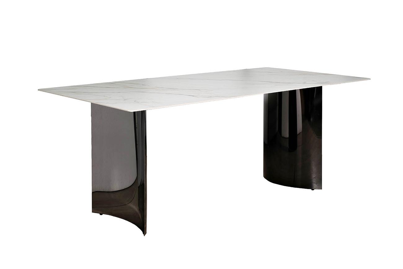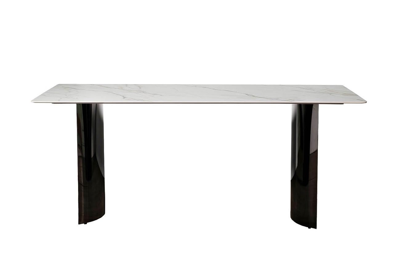 Столешница изготовлена из прессованного при высокой температуре и давлении керамогранита с мраморным узором, и обладает высокими характеристиками износостойкости, что является несомненным преимуществом для обеденного стола. Опоры, вогнутые внутрь, имеют г...