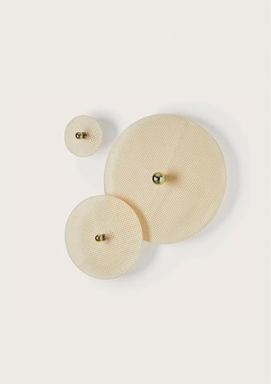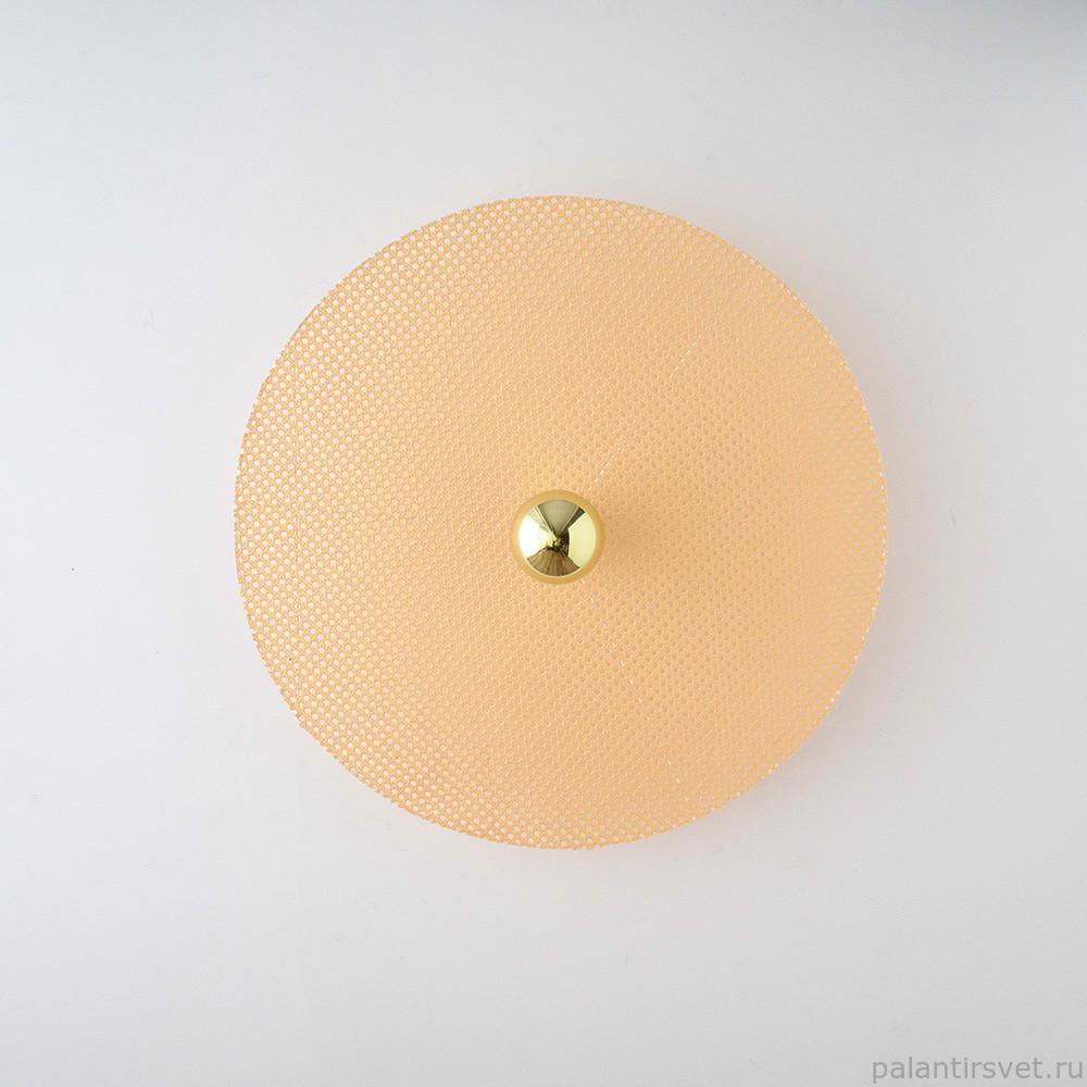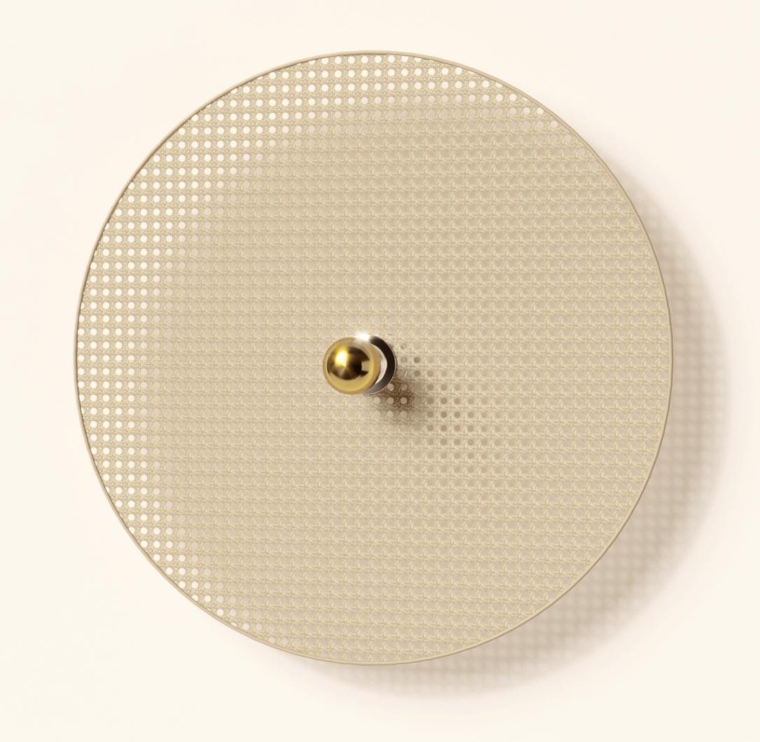 Настенное бра, выполненное из металла и ротанга в современном стиле. Состоит из металлического фиттинга размером 5 см золотого цвета и рассеивающего диска из ротанга 90 см в натуральном цвете.