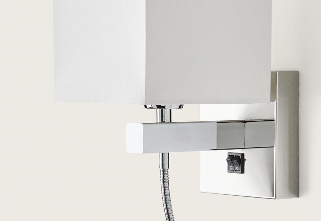 Модель Read выполняет сразу две ключевые функции настенных светильников: она несёт отражённый свет и создаёт направленное освещение для решения конкретных задач — чтения, скетчинга, сёрфинга в интернете. Дизайнерам удалось элегантно совместить абажур и ридер в одном держателе цвета хром: два элемента выступают как будто продолжением один другого, расположенные по одной оси.Белый абажур светильника Read выполнен из ткани, опорные элементы — из металла. Лампочка Е27 не идёт в комплекте со светильником, а ридер заботливо лампочкой оборудован — это светодиод мощностью 3 Вт со световой температурой 3000 К. Для управления светом в панель бра встроен двойной переключатель.