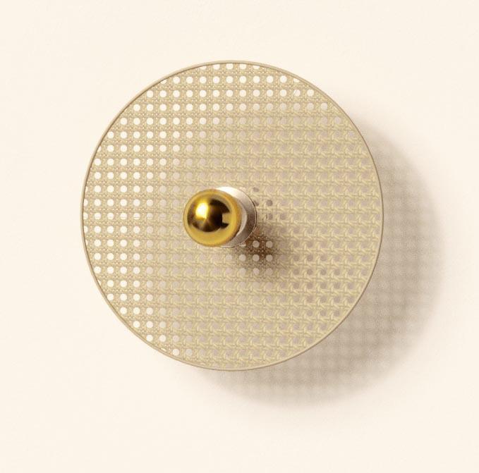 Настенное бра, выполненное из мателла и ротанга в современном стиле. Состоит из металлического фиттинга размером 5 см белого цвета и рассеивающего диска из ротанга 30 см в натуральном цвете.