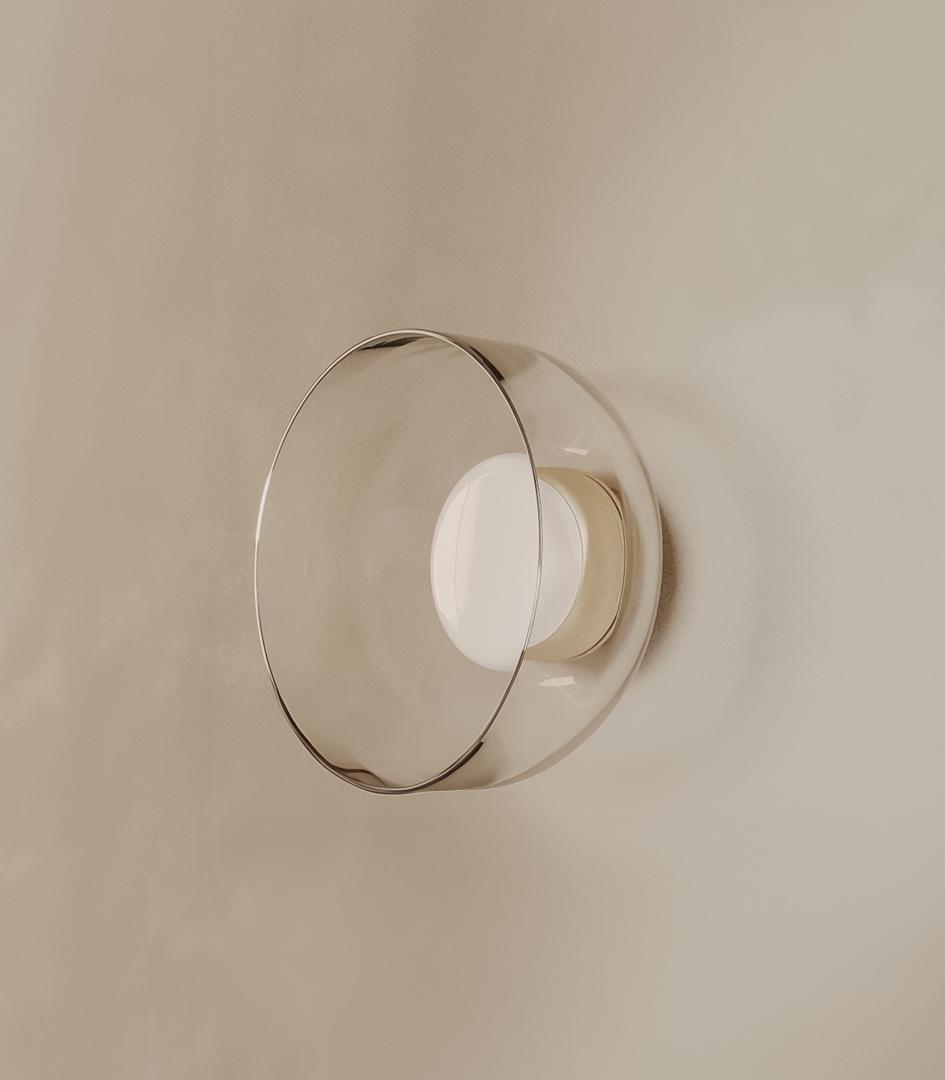Настенный светильник Ipon от фабрики Aromas Del Campo – глянцевый блеск стекла как дополнение к световому акценту. Настенный светильник Ipon – поможет создать необычную и стильную подсветку комнаты и вывести ее дизайн на новый уровень. Комбинируя несколько светильников рядом, используя оба цвета, представленные в коллекции, закрепляя их на разной высоте, вы превратитесь в настоящего дизайнера. Вперед к новым горизонтом вашего интерьера! Настенный светильник Ipon состоит из чашеобразного абажура и металлического основания для крепежа к стене. Абажур сделан из прозрачного или затемненного ударопрочного стекла. Его ширина по нижнему краю 20 см и глубина 10,2 см. При желании можно выбрать цветное стекло по каталогу производителя. Абажур закреплен на круглом основании черного или золотого цвета. Его диаметр 8 см, глубина 2,5 см. Цвет основания на ваш выбор – черный матовый или золотой. Порошковое покрытие обеспечивает идеально ровную поверхность и защищает металл от негативного воздействия влаги, ультрафиолета. В плафон вставлена круглая LED-лампа диаметром 10 см и характеристиками: мощность – 10 W, цветовая температура – 2700 K, яркость – 810 lm. Лампочка в комплектацию входит. Для регулировки яркости светового потока установлен диммер. Необходимое напряжение – 220-240 W, частота переменного тока – 50-60 Гц. Размеры: высота – 20 см, ширина – 20 см, глубина – 14,5 см. Вес с упаковкой – 2.1 кг. Гарантия 12 месяцев. В коллекцию Ipon также включены настольная лампа и подвесной светильник. Светильники Aromas Del Campo изготавливаются вручную с использованием традиционных стеклодувных техник. В связи с особенностями ручного производства в стекле могут присутствовать: Небольшие пузырьки воздуха – естественный результат выдувания стекла. Легкие неровности и волнистость – придают изделию уникальный характер. Микродефекты формы и толщины – свидетельство авторской работы, а не производственного брака. Эти особенности не влияют на функциональность и являются частью эстетики стекла ручного производства, подчеркивая его аутентичность и индивидуальность. Каждый светильник Aromas Del Campo – единственный в своем роде, и небольшие отличия от фотографий на сайте не являются основанием для возврата или обмена. Благодарим за понимание и выбор настоящего ручного изделия!