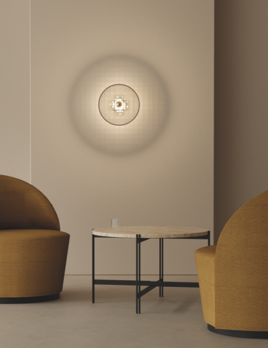 Настенный светильник, составляемый из металлического цоколя A1053/5 см и стеклянного диска 1225 Ø 30 cm или Ø 50 cm с черной окантовкой.