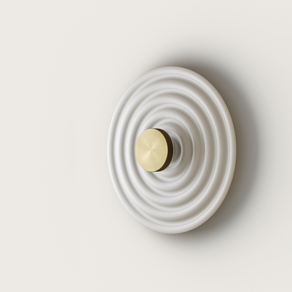Настенный светильник с абажуром из полирезина и металлическим диффузором в латунной или хромированной отделке.