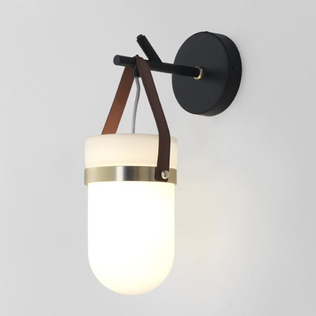 Настенный светильник Almon оригинального дизайна. Черная структура гармонирует с охристыми цветами ремешка, абажура и деталей золотого цвета.