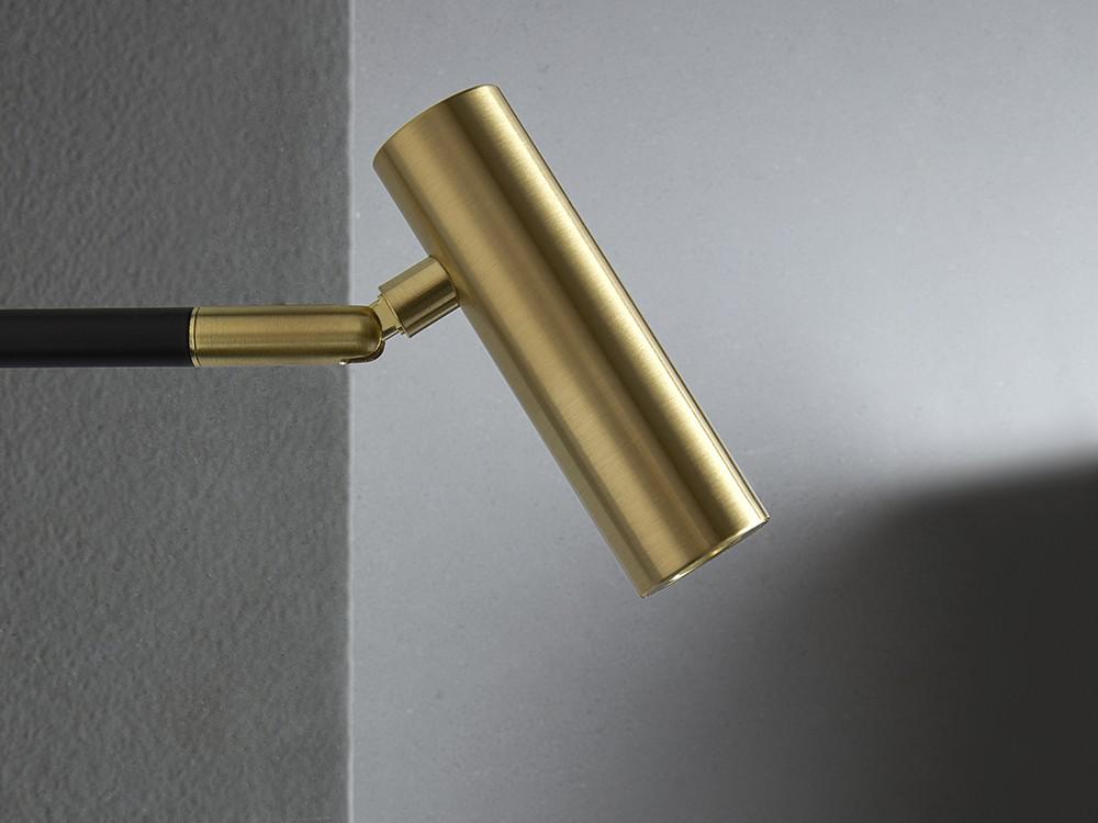 Дизайнерский настенный светильник с матовой черной металлической основой и регулируемым металлическим плафоном с латунной или матовой черной отделкой. С поворотным механизмом и сенсорным выключателем. Светодиод включен.