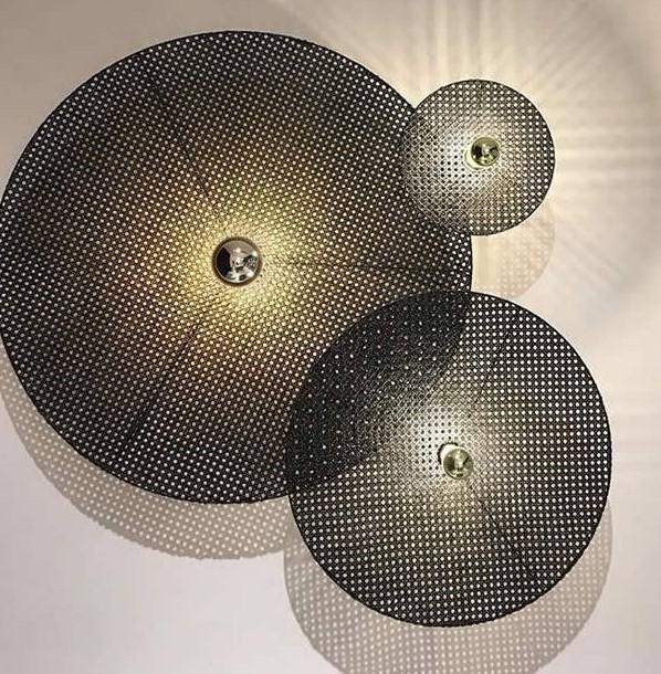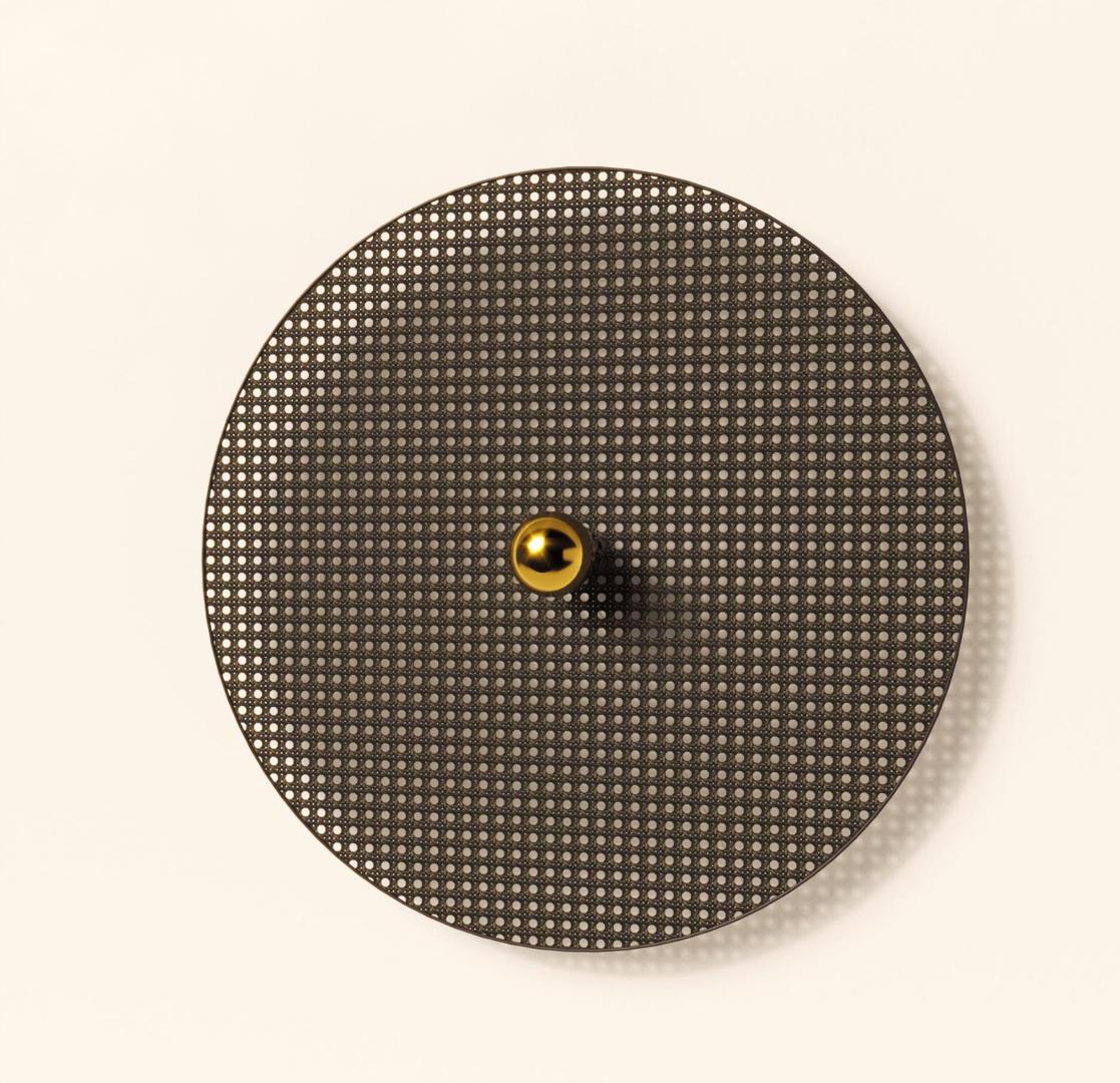 Настенное бра, выполненное из мателла и ротанга в современном стиле. Состоит из металлического фиттинга размером 10 см золотого цвета и рассеивающего диска из ротанга 60 см в черном цвете.