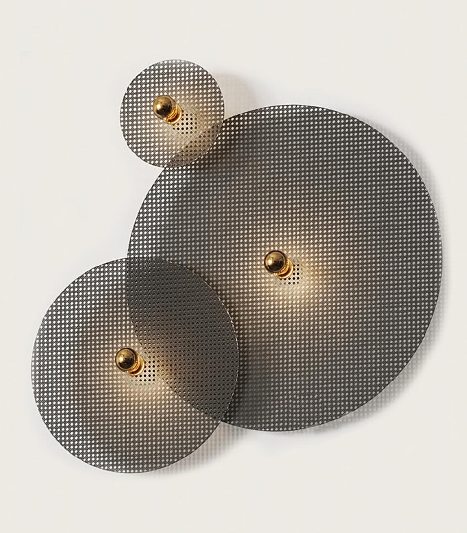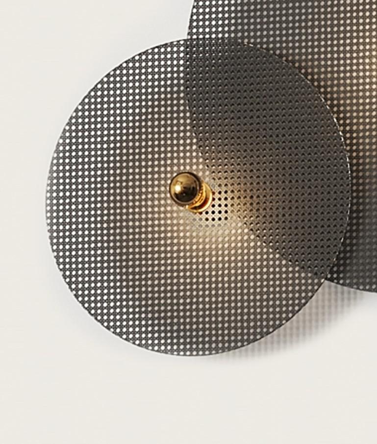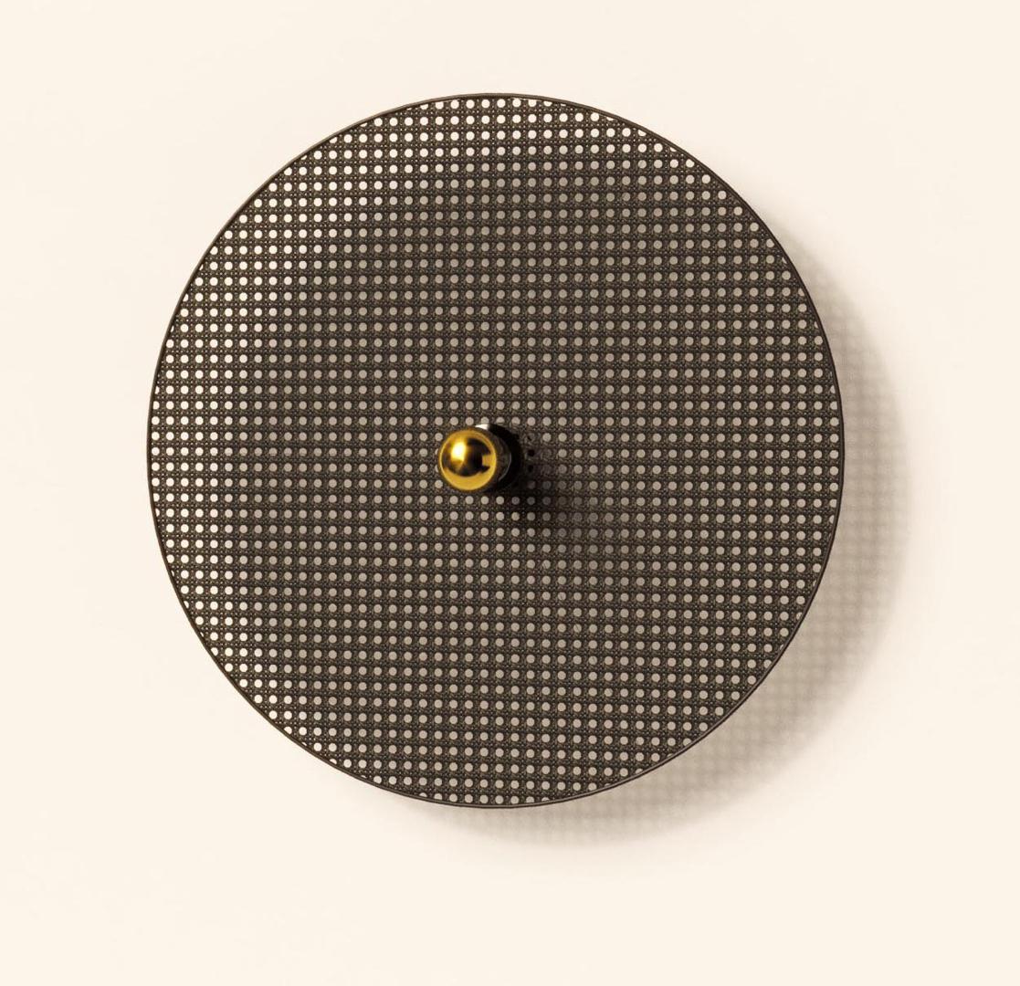 Настенное бра, выполненное из мателла и ротанга в современном стиле. Состоит из металлического фиттинга размером 10 см золотого цвета и рассеивающего диска из ротанга 60 см в черном цвете.