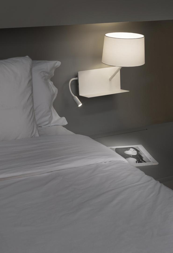 Применить со светодиодным считывателем, разработанным Jordi Blasi . Этот настенный светильник имеет минималистичный и очень городской стиль. Он имеет вход USB и полку для поддержки мобильного телефона или книги. Эта лампа идеально подходит для освещения комнат , она позволяет нам сэкономить место на тумбочке, а светодиодный считыватель идеально подходит для чтения в постели.