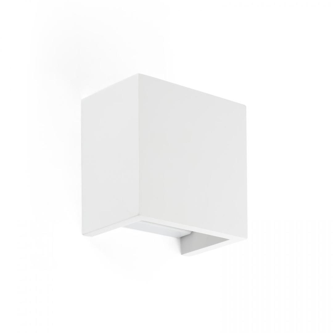 "Настенный светильник квадратный и белый, гипсовый. Этот настенный светильник дает свет сверху и снизу, что позволяет освещать комнату более равномерно. Светильник в современном стиле с чистыми линиями.