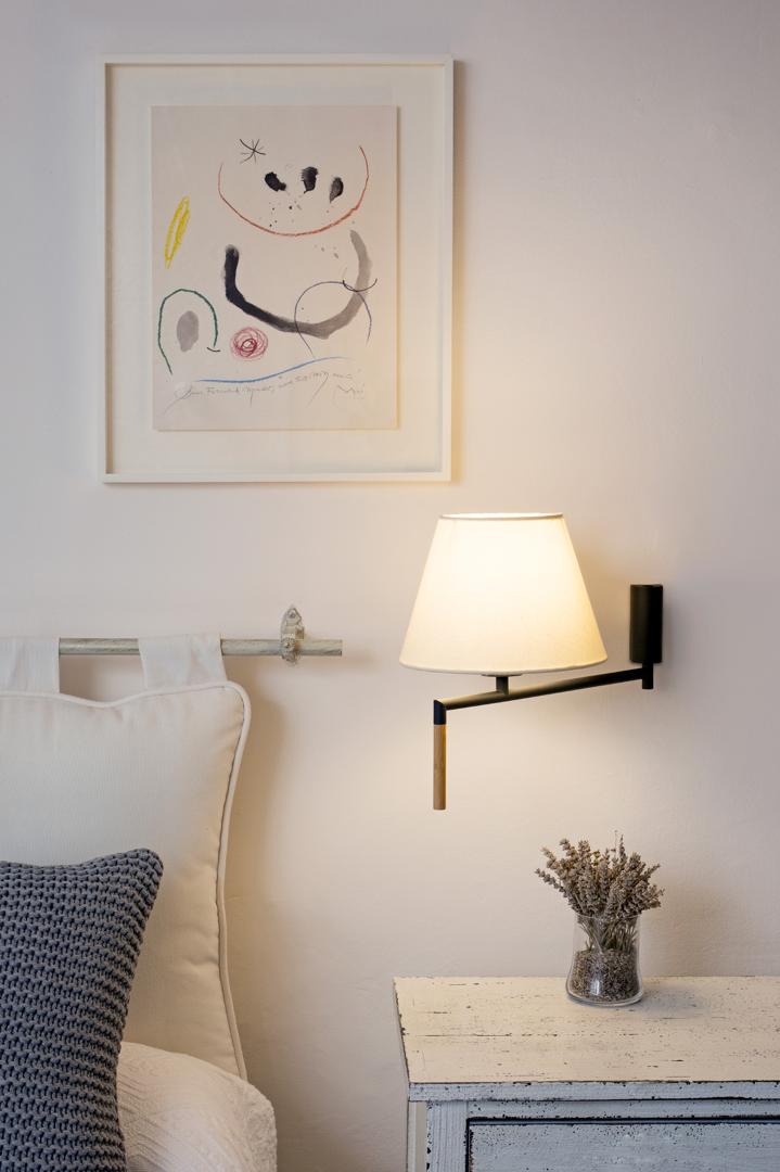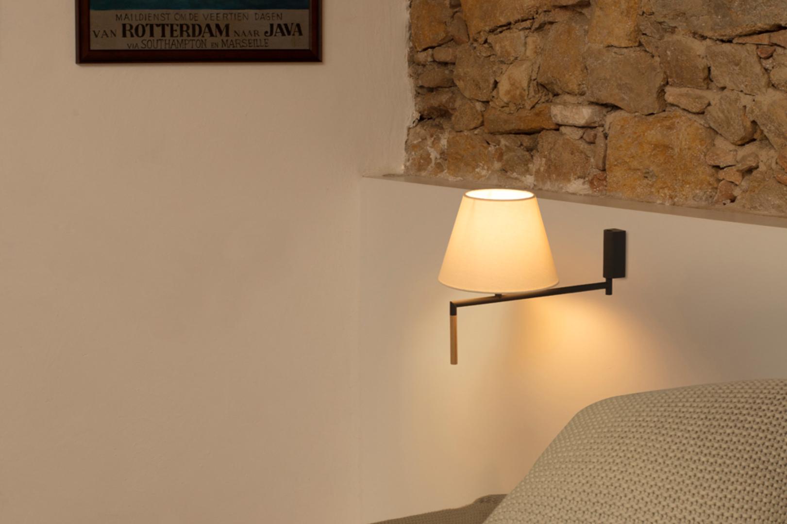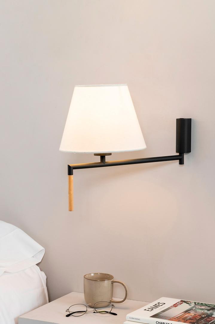 RON - настенный светильник для внутреннего освещения. Конструкция, оформленная в изящном и современном стиле, спроектирована Пепе Ллауде и имеет металлическую часть и одну из бамбука. Отделка абажура бежевого цвета.