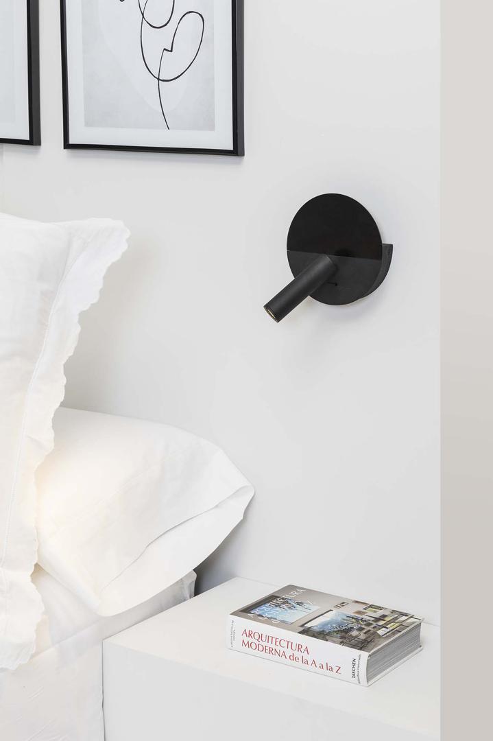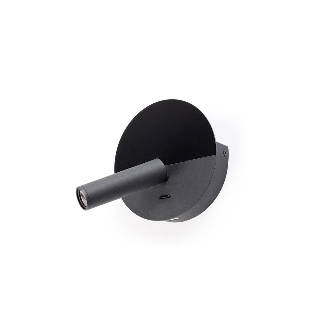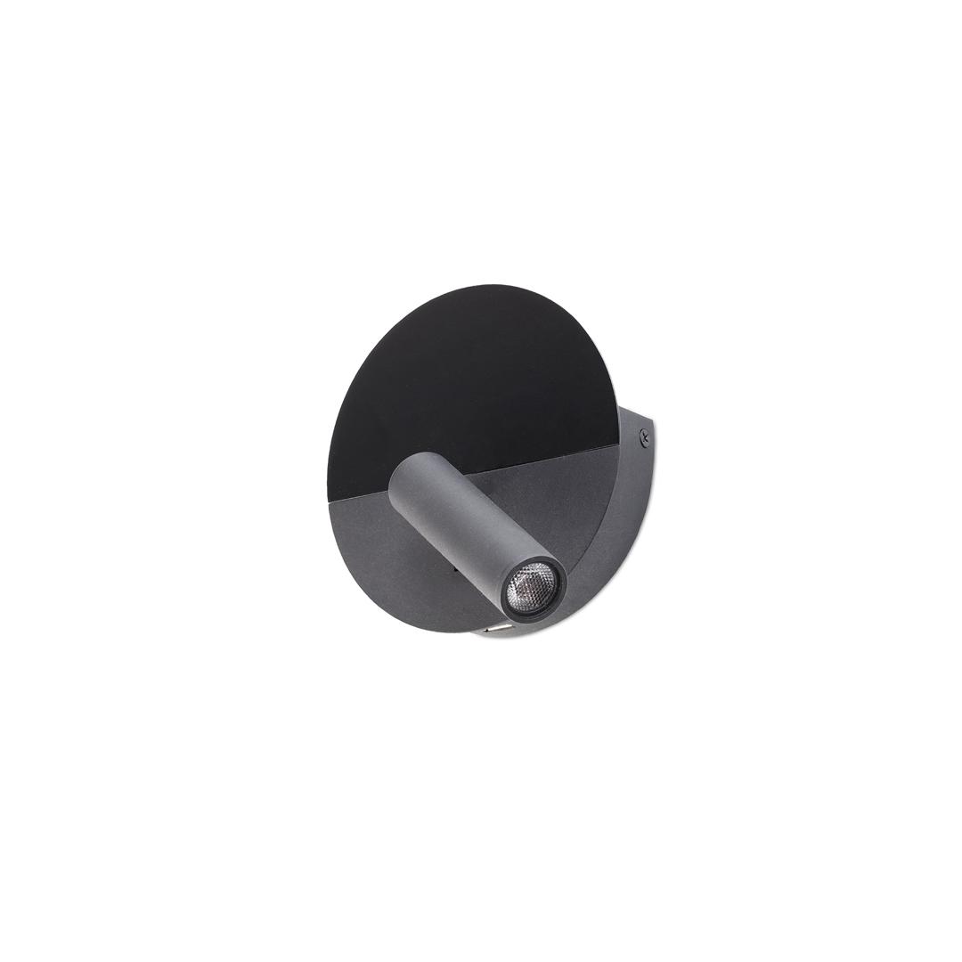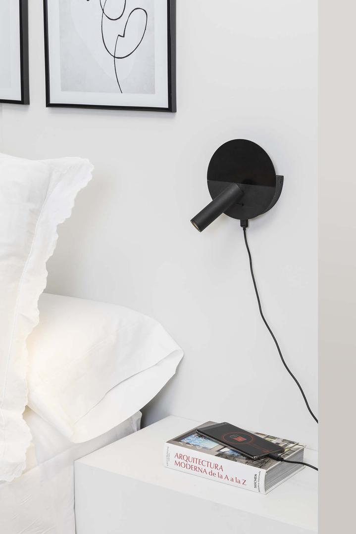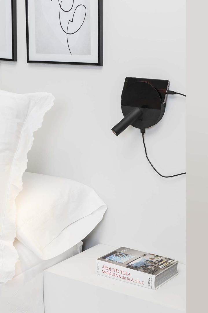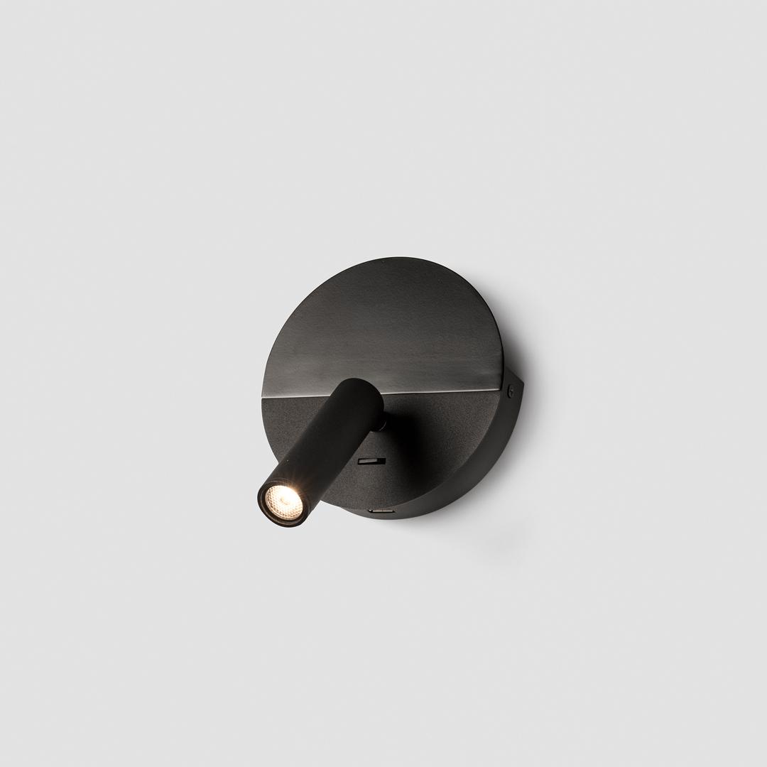 DUAS — это чёрный настенный светильник для чтения, разработанный Faro Lab и изготовленный из стали. Его круглая форма разделена на две части, причём верхняя часть более матовая. Он оснащён USB-входом Type-C мощностью 5 Вт, идеально подходящим для зарядки мобильного телефона, и небольшим поддоном сзади, чтобы оставлять устройство во время зарядки. DUAS идеально подходит для освещения помещений.