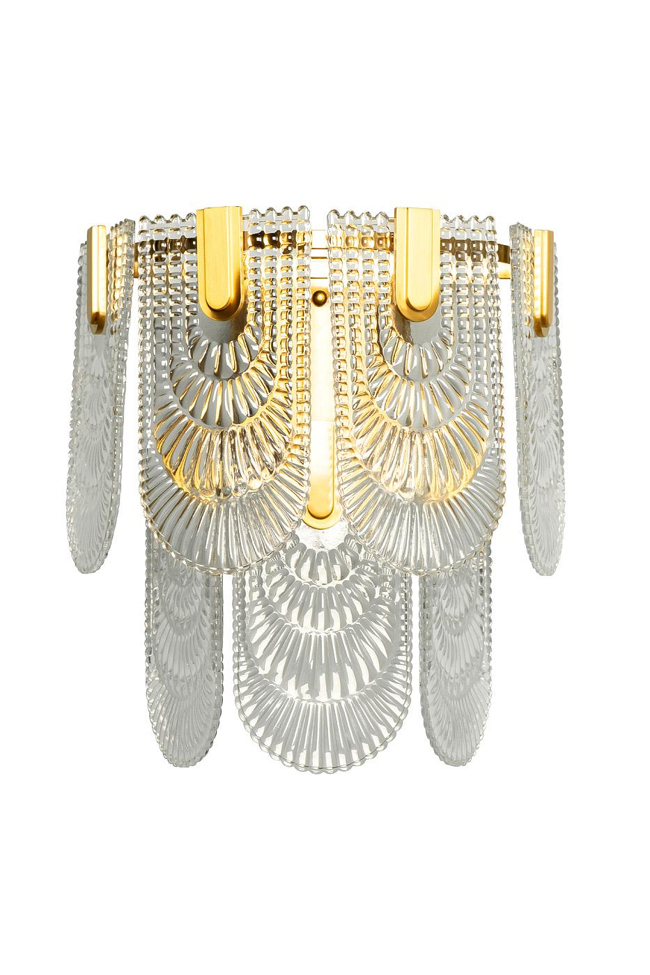 description-full - Дизайнерский светильник бра в стиле ар-деко сочетает в себе легкость прозрачного стекла и изысканность позолоченного металла. Оригинальные кружевные подвесы добавляют ему аристократизма и вносят настроение роскоши в обстановку. Стеклянные бра в гостиной играют ключевую декоративную роль – они делают световой акцент на панно, зекрала или картины, а также являются самостоятельным элементом настенного декора. Бра позволяют осветить конкретную зону, сконцентрировав все внимание на ней, или добавить мягкого свечения в комнату. На сайте Garda Decor вы можете купить разнообразные настенные бра в зал, спальню или прихожую в стилистике современного ар-деко.