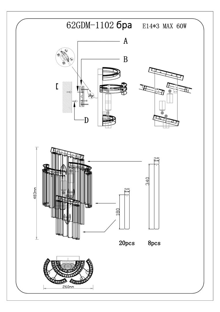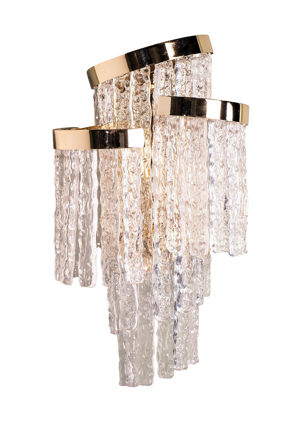 description-full - Бра из стекла подойдёт ценителям оригинального интерьера и роскошных предметов дизайна. Стеклянные трубочки разной длины создают изящную композицию, напоминающую каскады тропических водопадов. Выбрав современное бра на стену вы сможете подчеркнуть дизайн любой комнаты, дополнив её стильным элементом интерьера. Источники света располагаются на кольцевых позолоченных каркасах изделия и направлены вниз. Такое дизайнерское решение помогает создать мягкое и очень уютное освещение. Именно поэтому изделие универсально и прекрасно впишется в любое домашнее пространство. Можно разместить бра в гостиной, спальне, прихожей или обеденной зоне.