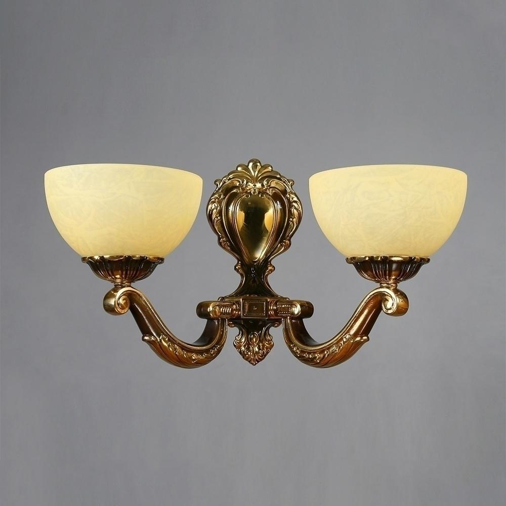 Настенный светильник, выполненный из латуни в блестящей бронзовой отделке и двумя плафонами из стекла.