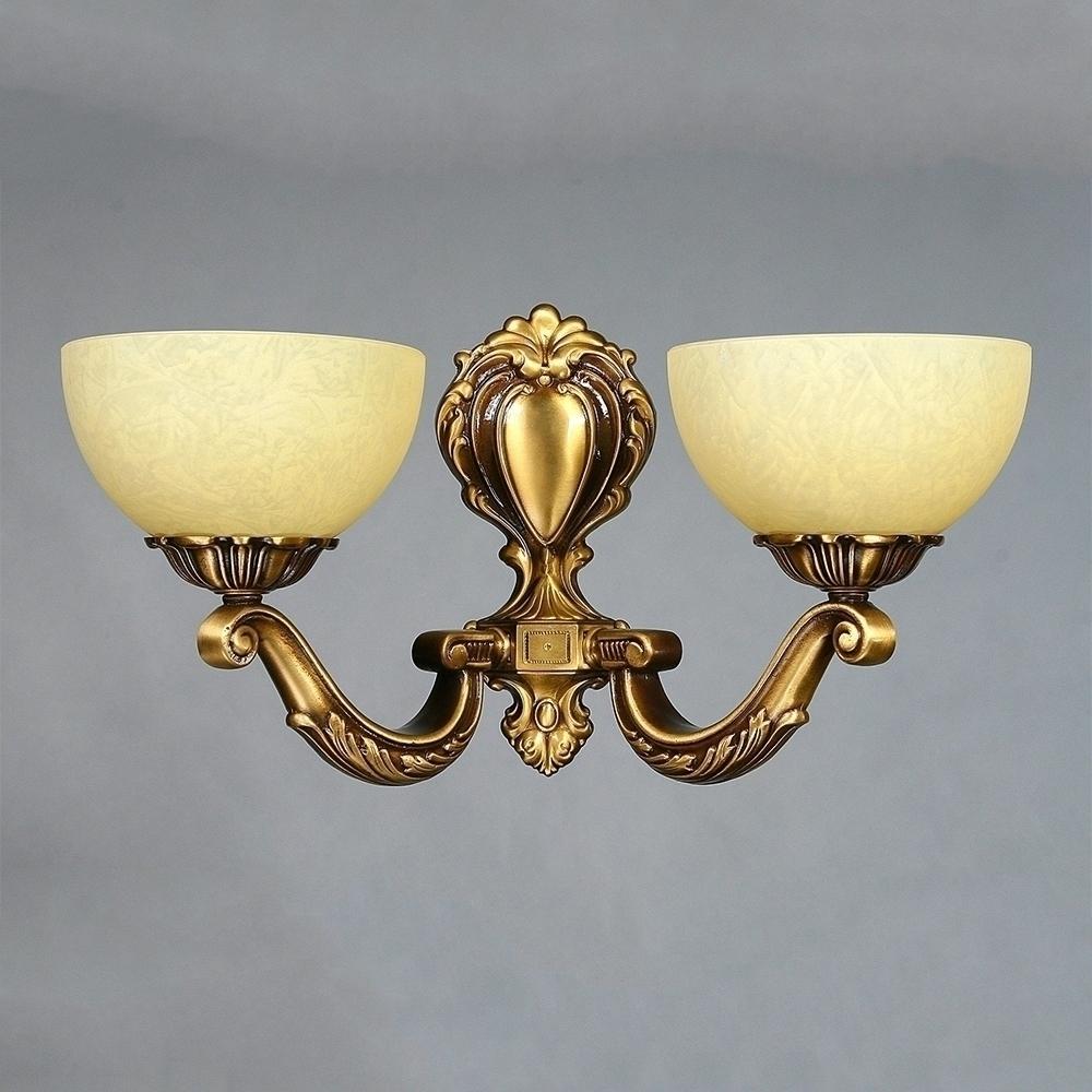 Настенный светильник, выполненный из латуни в матовой бронзовой отделке и двумя плафонами из стекла.