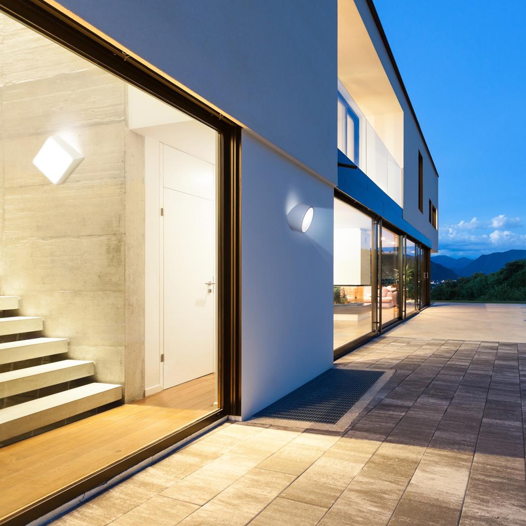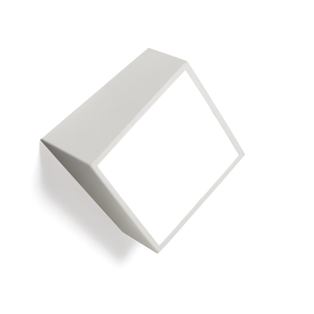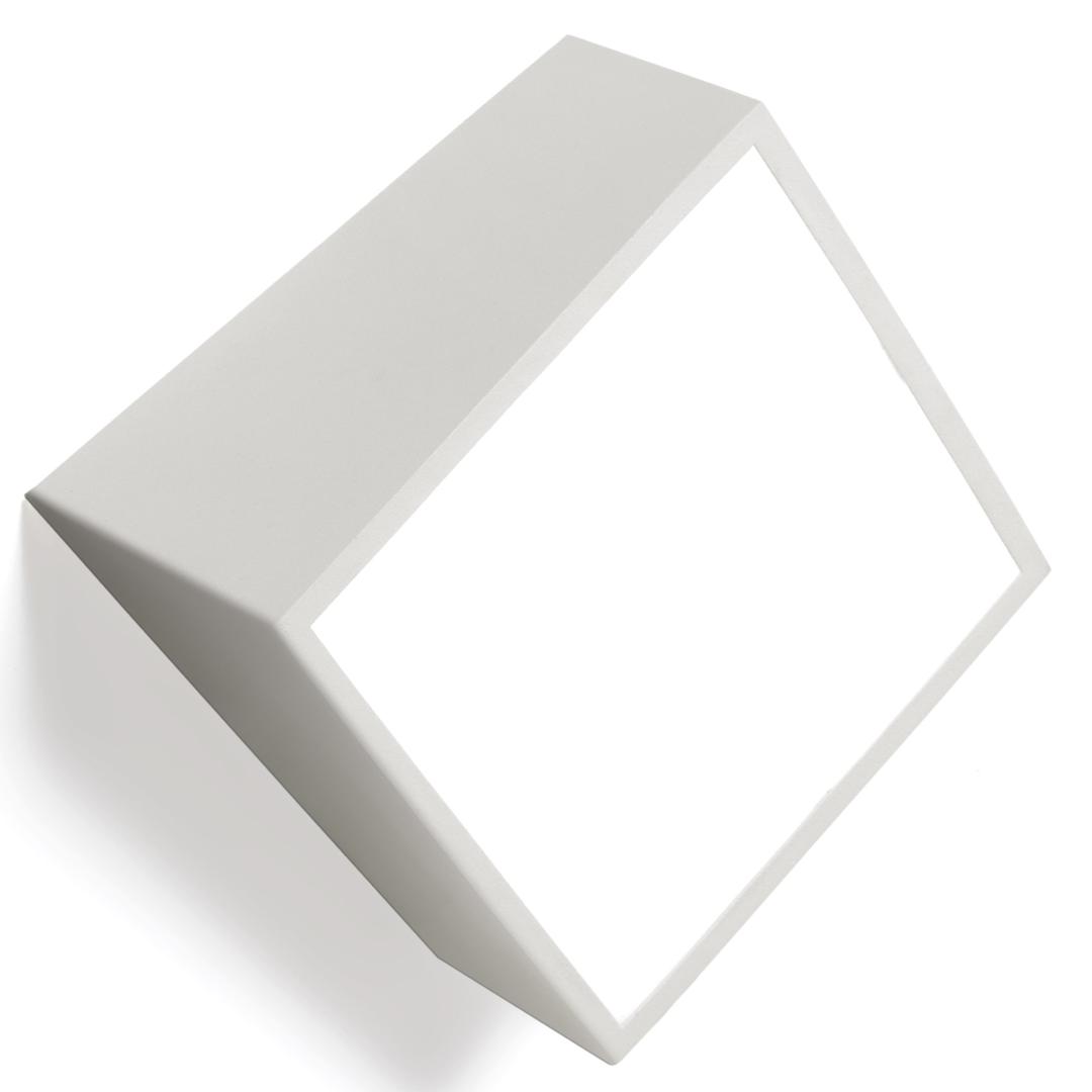 Настенный квадратный светильник Mini, выполненный из металла в белом цвете с защитными диффузорами спереди и сзади и двумя светодиоидными лампами рассеянного освещения.