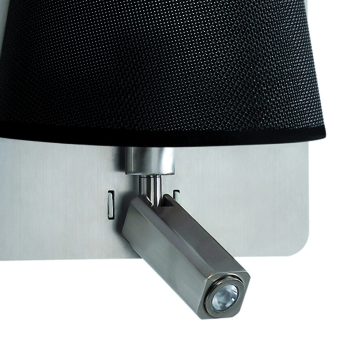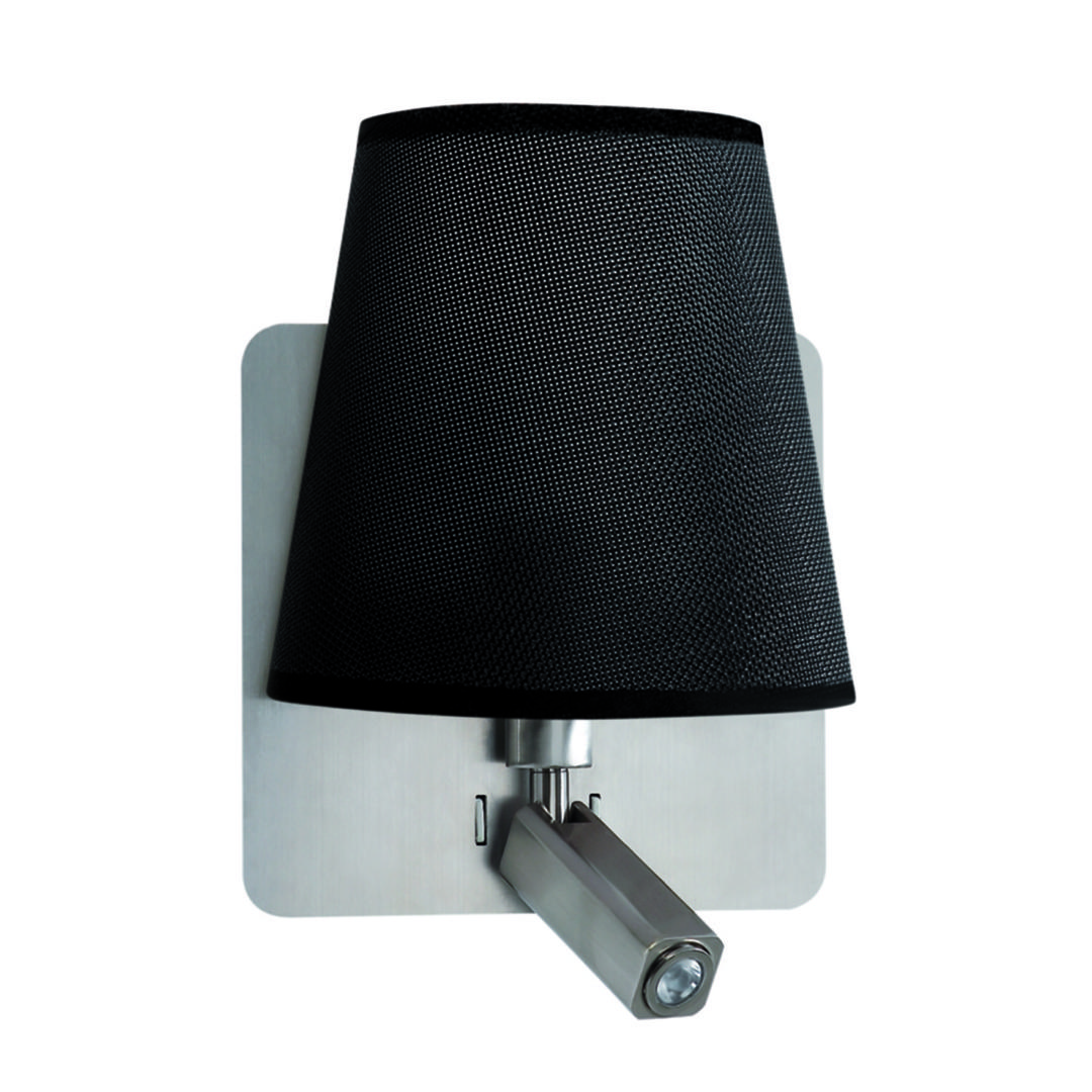 Бра Bahia, выполненное из металла с настенным креплением, тканевым абажуром с лампой рассеянного света с рычагом в виде прямоугольного плафона с лампой направленного освещения. Доступно в черно-сатиновом цвете.