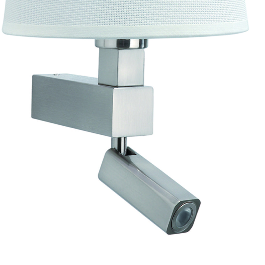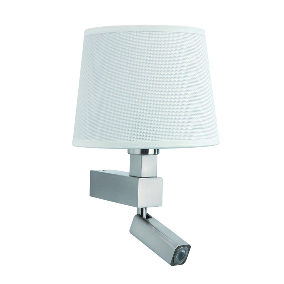 Бра Bahia, выполненное из металла с тканевым абажуром с лампой рассеянного света с рычагом в виде прямоугольного плафона с лампой направленного освещения. Доступно в бело-бронзовом цвете.