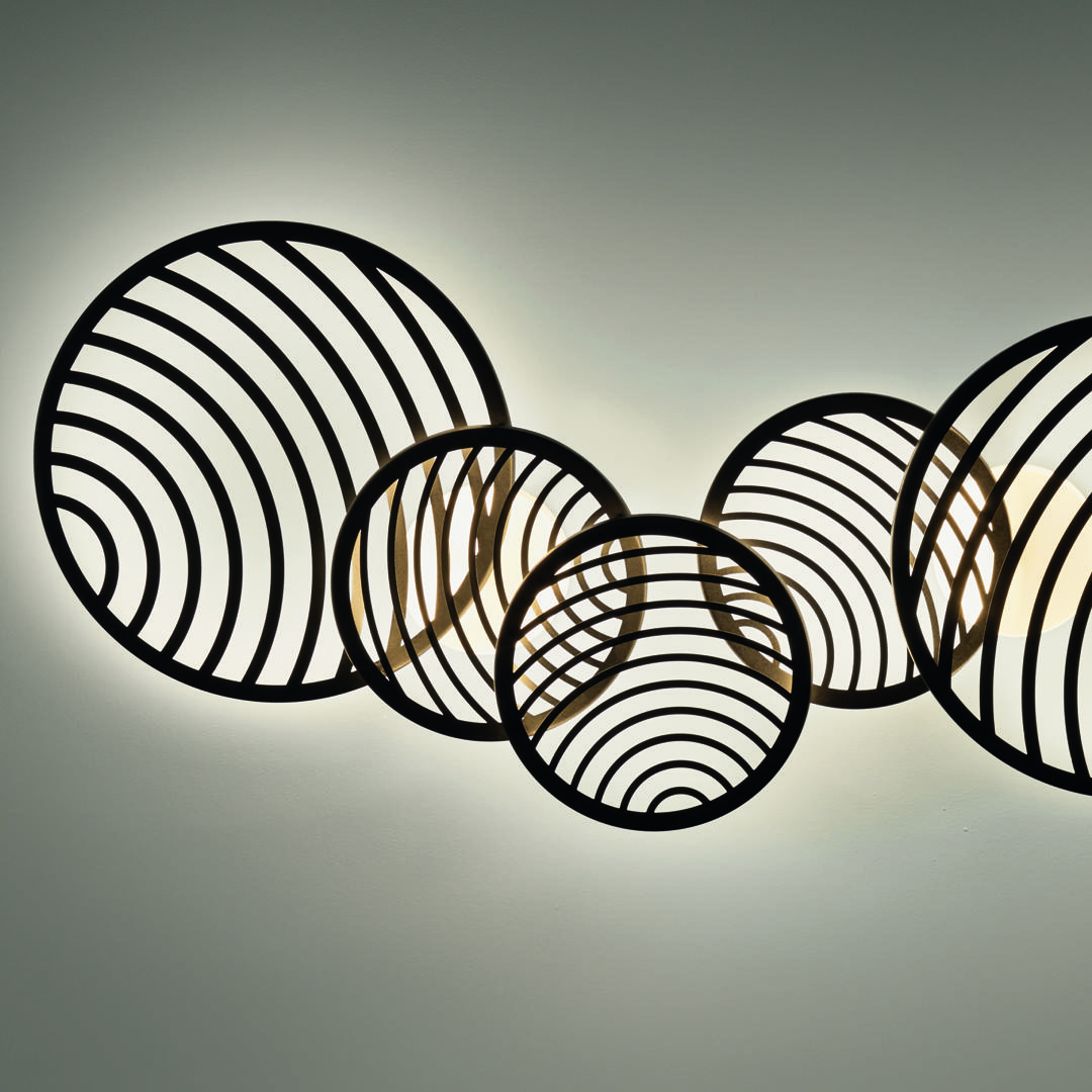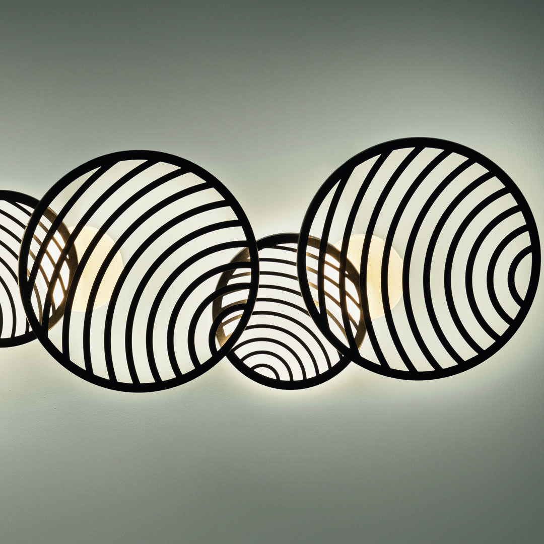COLLAGE представляет собой модульную коллекцию настенно-потолочных бра, которые играют с оптическими иллюзиями. В своем дизайне Сантьяго Севиллано использовал прием наложения двух сетчатых рисунков. Модули объединяются друг с другом, создавая композиции, которые вызывают эффект муара. Светодиоды расположены как на пересечении, так и по всей окружности плафона. Это функциональное сочетание позволяет осветить пространство не только эффектно, но и эффективно. Благодаря гибкому и многофункциональному дизайну, коллекцию можно использовать в разных сценариях и вариациях, создавая уникальные решения для вашего интерьера. Коллекция COLLAGE дает возможность складывать сложные и оригинальные композиции с помощью всего нескольких элементов. Интригующие светильники создадут таинственный образ и интимную атмосферу в пространстве спальни, испуская разнонаправленный и мягкий свет. Накладные бра коллекции также можно использовать в качестве декоративной подсветки в гостиной и кабинете, задавая ритм интерьеру и организуя его пространство. COLLAGE создаст приятную освещенность и придаст динамичности коридорам и лестничным пролетам и визуально увеличит их. Также коллекция может быть использована как основная световая группа в качестве потолочного освещения.