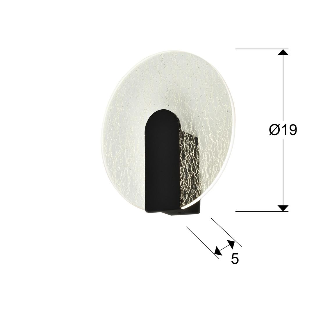 Настенный светильник из металла и алюминия, матовая черная отделка. Круглый рассеиватель из прозрачного акрила, декор микропечатью: текстура в произвольные золотые полосы. Светодиод 5,5 Вт, 450 лм, 3000 К