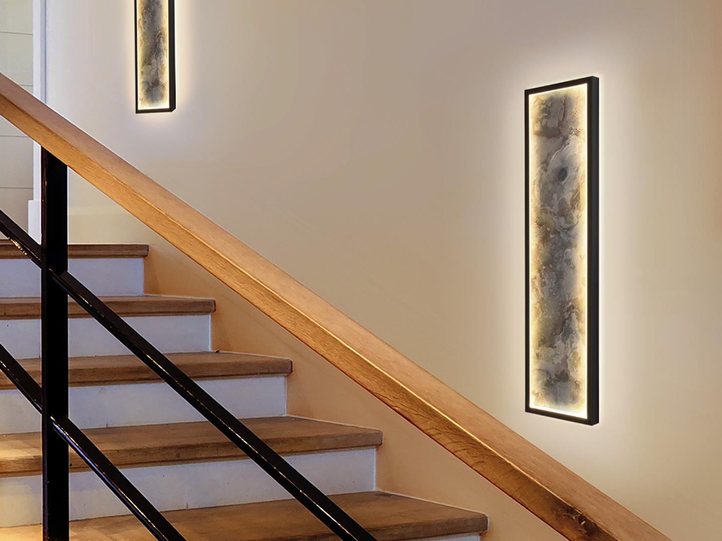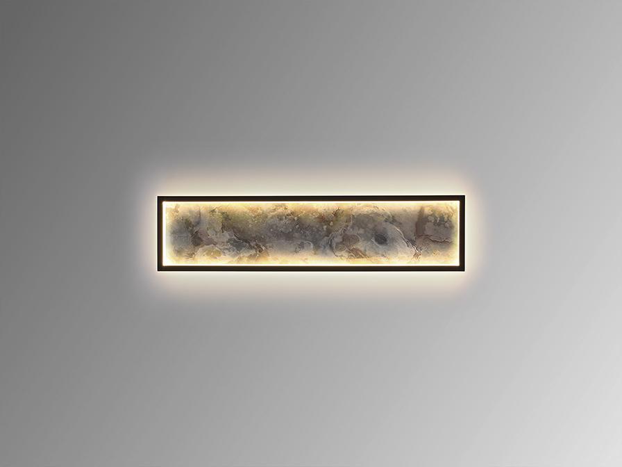 Прямоугольный настенный светильник или потолочный светильник. Изготовлен из металла с черной отделкой и многоцветным сланцем, с опаловой акриловой рамой. Светодиодный светильник 52 Вт, 947 лм, смена цвета CCT, 3000/4000/6000 К. Выбор цветовой температуры CCT осуществляется с настенного переключателя последовательными нажатиями клавиш. Включена функция памяти.