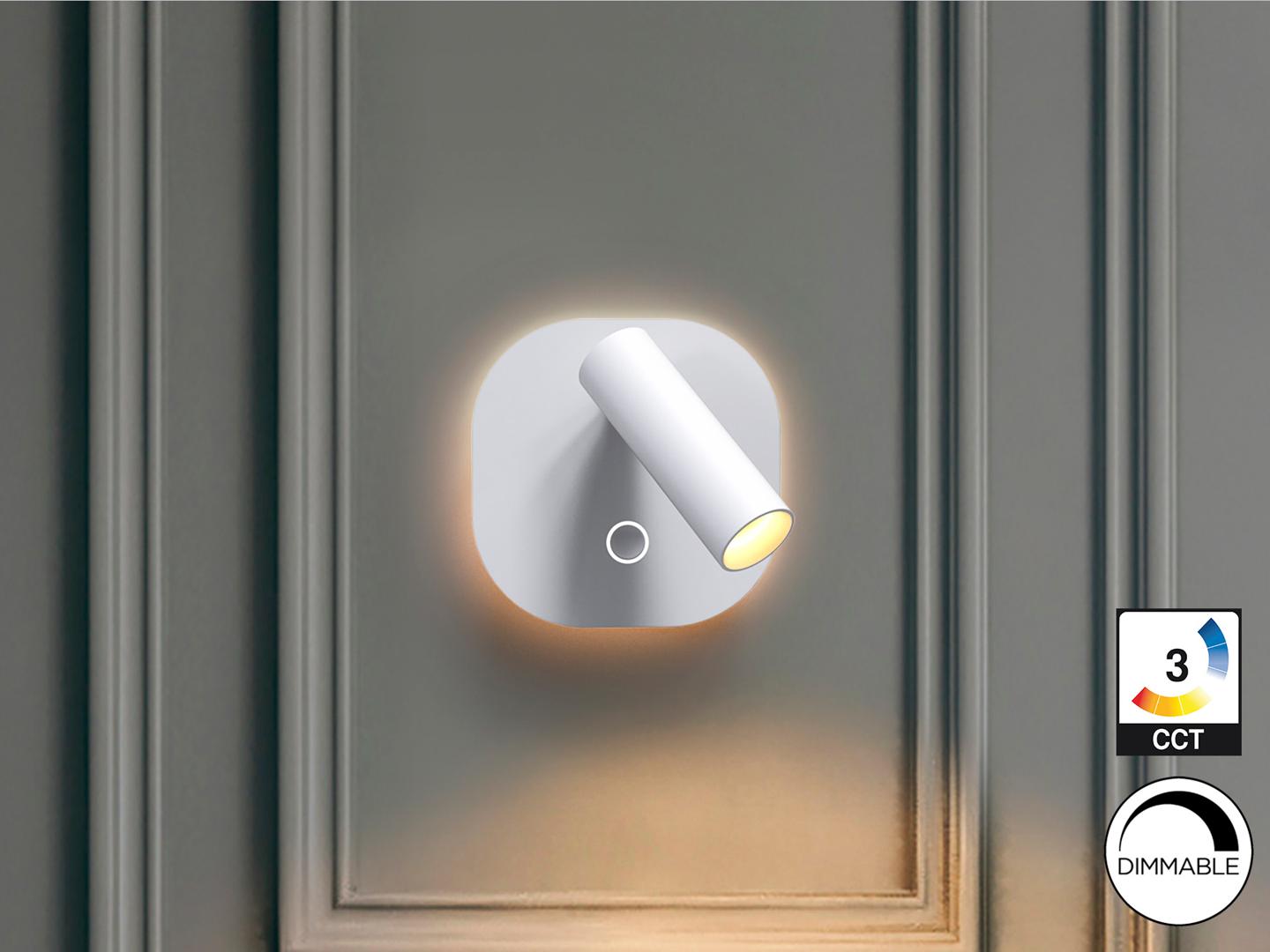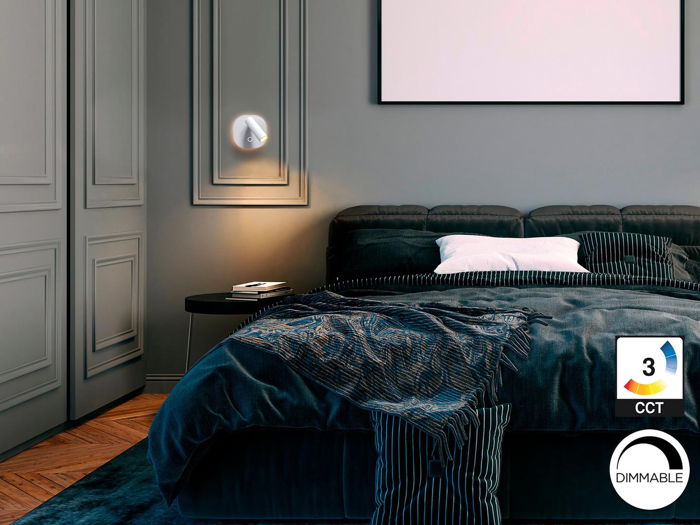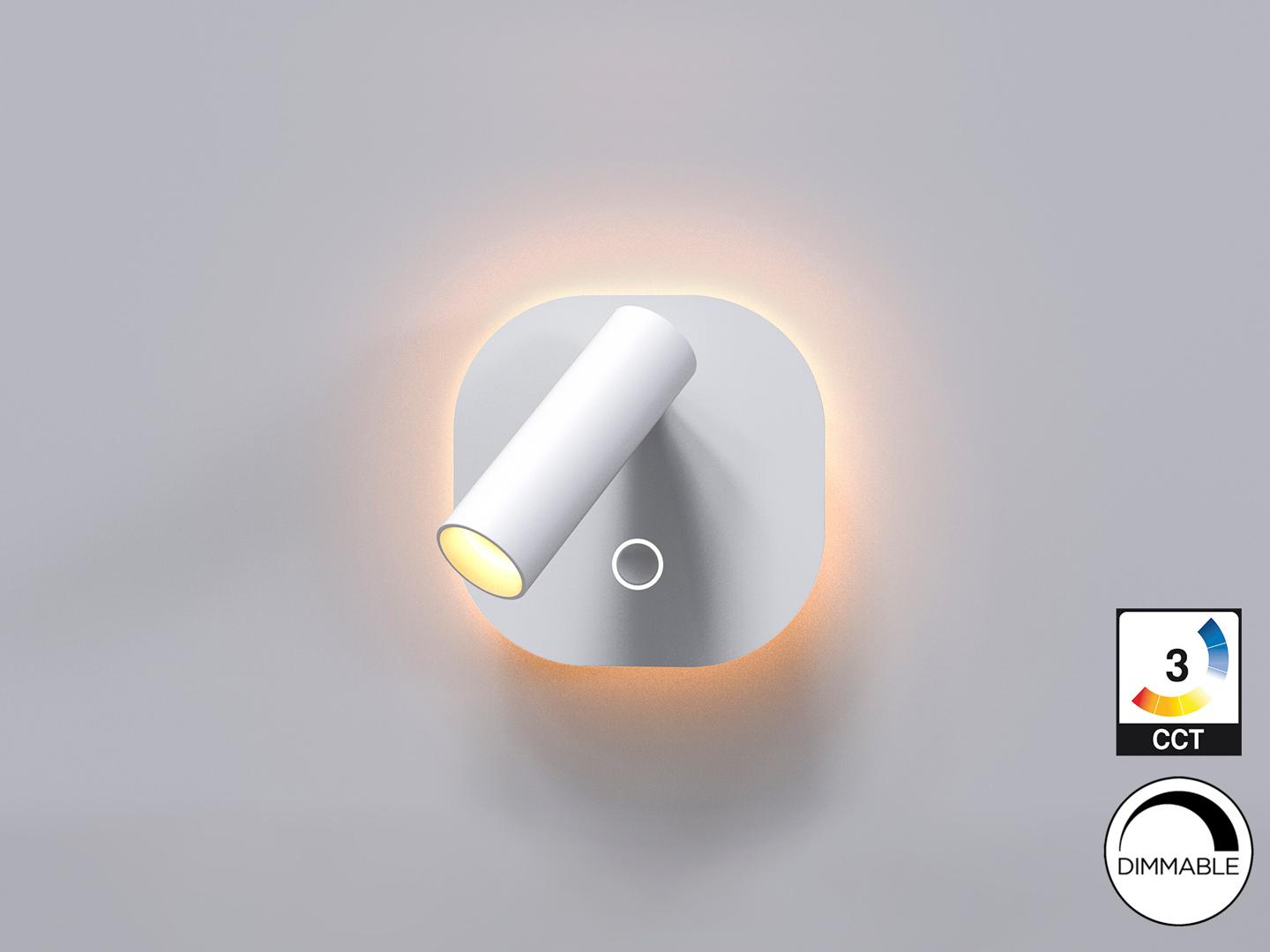 Алюминиевый настенный светильник, белый цвет. Освещение: лампа для чтения мощностью 2,1 Вт и подсветка 6 Вт, обе светодиодные лампы CCT с независимой регулировкой тембра и интенсивности с помощью сенсорной кнопки. Светодиод мощностью 8,1 Вт. Цветовая температура: 2700–4000 К. Световой поток: 167+391 лм. Регулировка яркости.