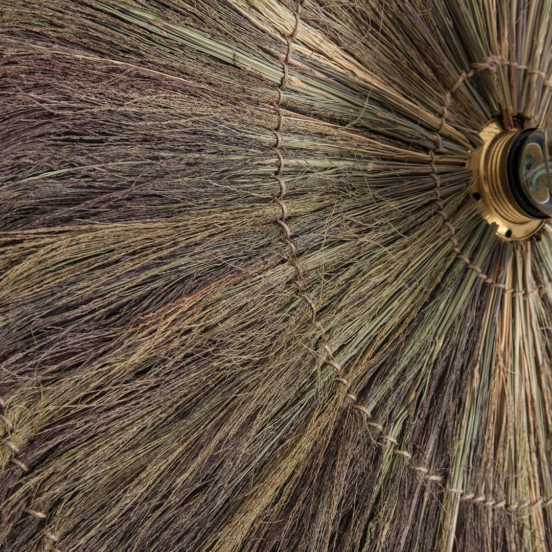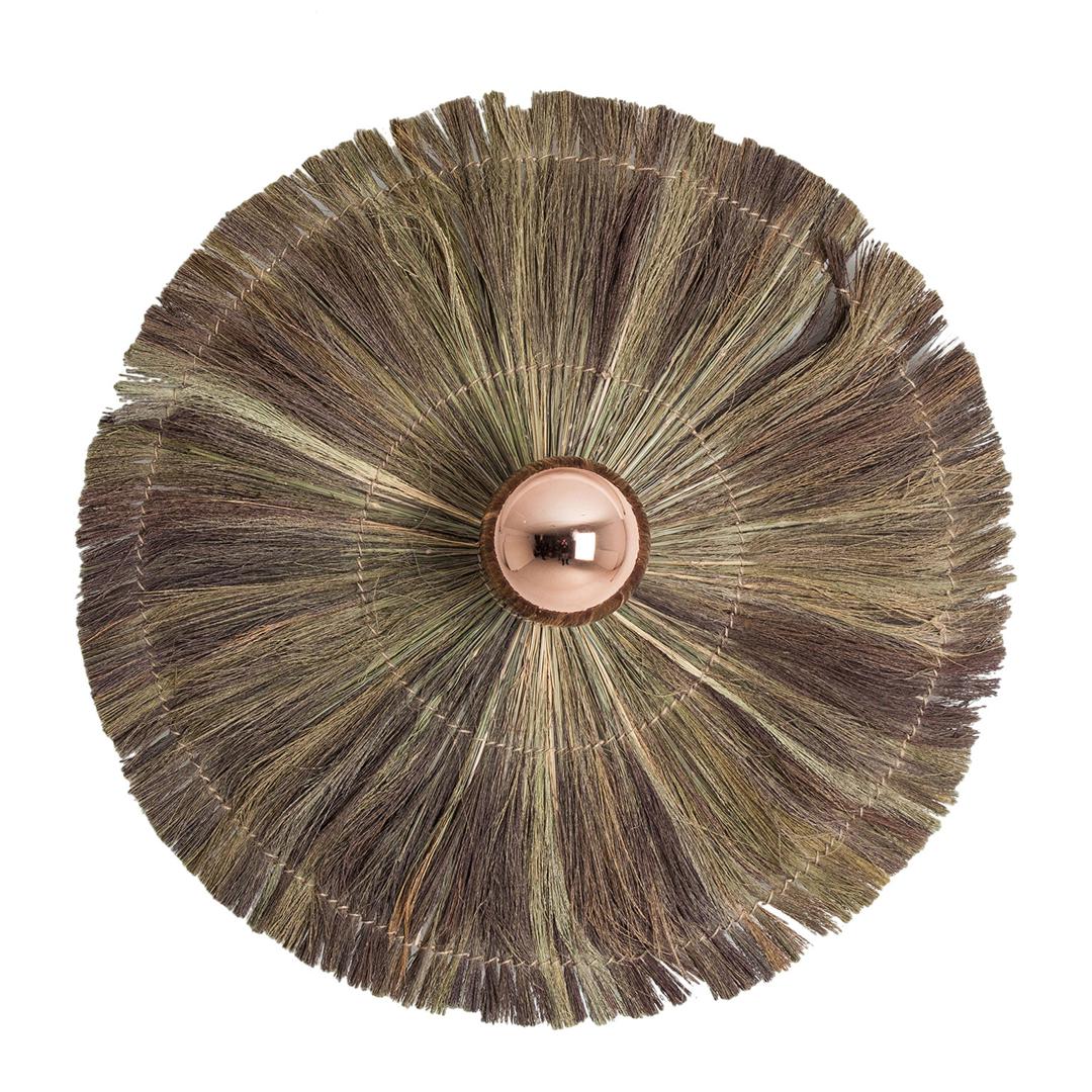 Настенный светильник круглый, коричневого цвета, в этническом стиле. Изготовлен из железа в сочетании с натуральным волокном.